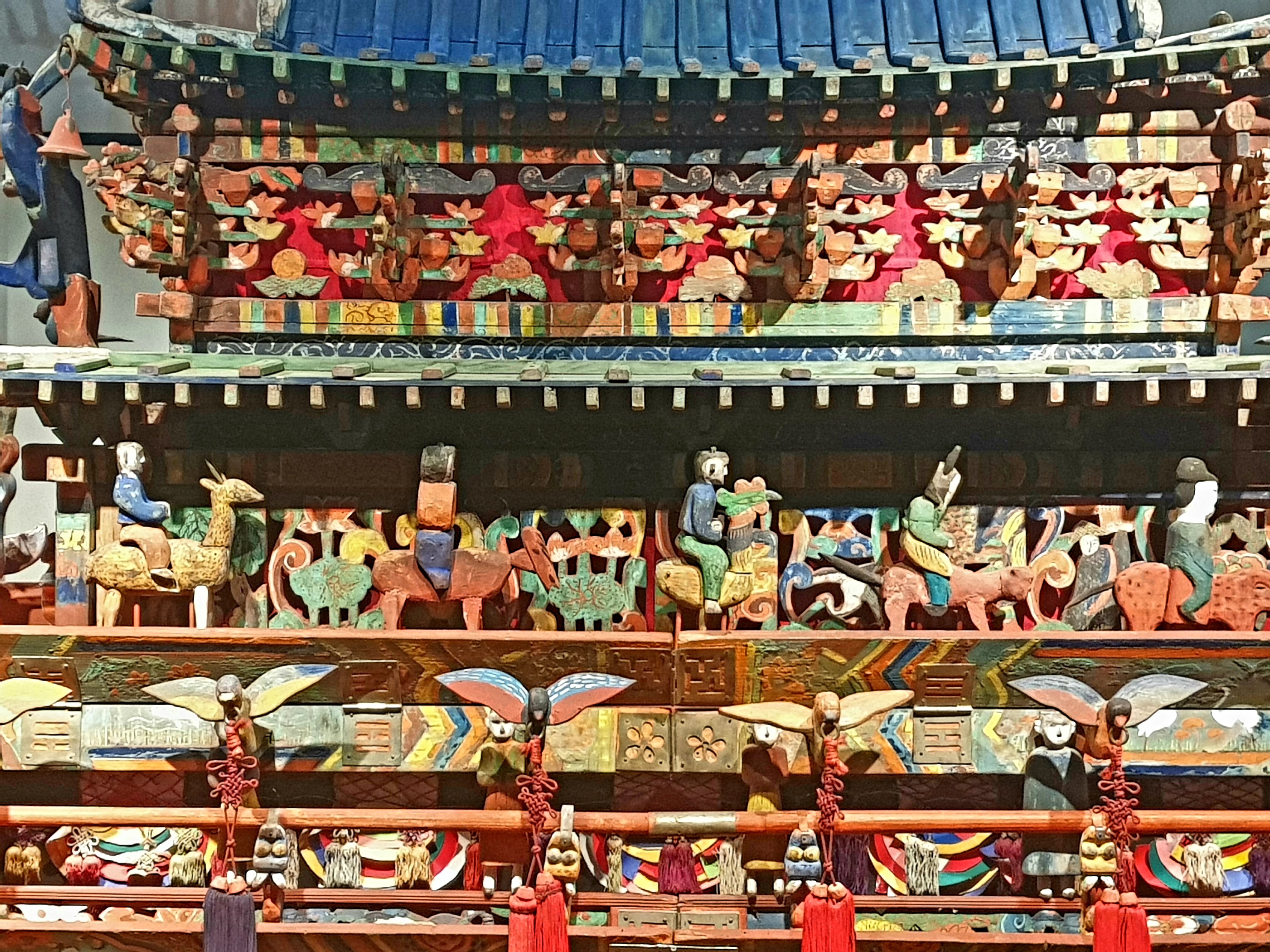 It is a four-story pavilion-shaped bler with each tier decorated with wooden dolls and figures of the twelve zodiac animals to guide the deceased to the other world.