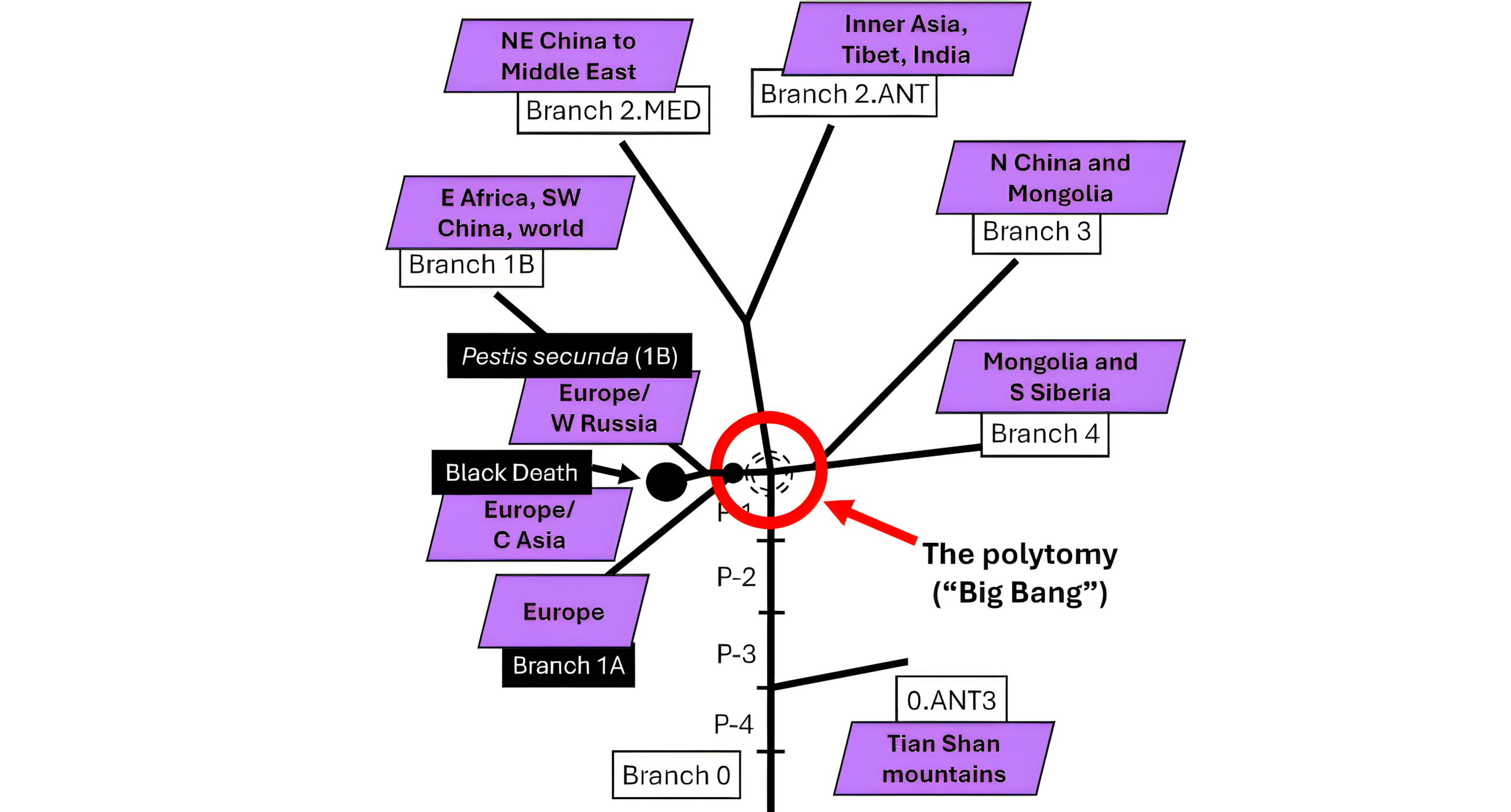 빅뱅Big Bang. 티안산 산맥Tian Shan mountains이나 그 주변에서 중세 후기에 확산되었을 것으로 추정되는 Y. pestis의 진화 과정을 나타낸 계통수(빅뱅)부터 현재까지 기록된 네 가지 계통(1~4번 분지)의 지리적 위치까지를 나타낸 계통수. 고대 DNA(aDNA)만으로 기록된 계통은 검은색 상자로, 현재 생존하는 계통은 흰색 상자로 표시되어 있다. 지리 분포는 마름모꼴로 표시했다. 출처: Medical History (2025). DOI: 10.1017/mdh.2024.29