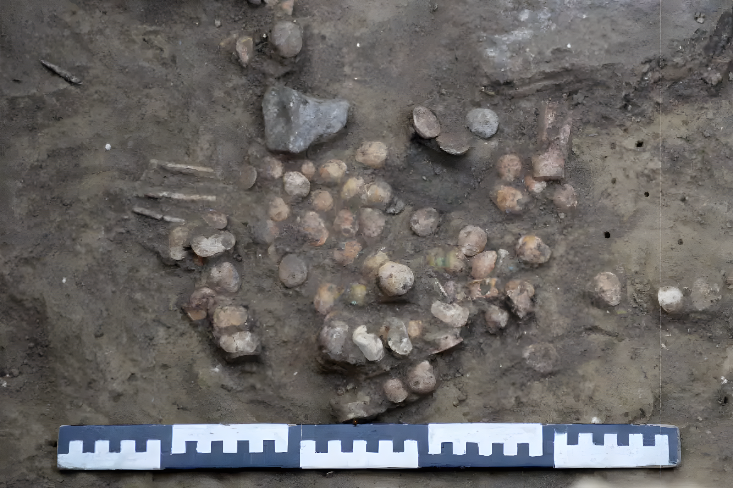 고고학들은 근처에서 뼈로 조각한 50개 이상 작은 반구형 게임 말을 발견했다.