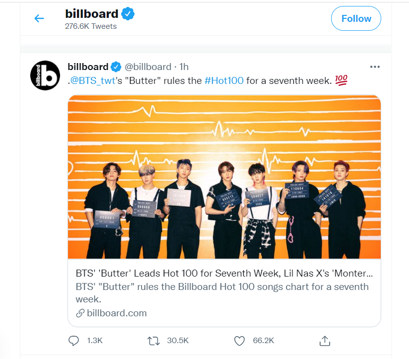 조금전 Billboard 공식 트위터 계정에 오른 소식이라, BTS 서머송 Butter가 7주 연속 빌보드 메인싱글즈 차트에서 먹었다는 골자라, 7주라면 두 달 가까이 정상을 지켰다는 것이니, 요즘처럼 유행이 더 빠른 시대에 놀라운 성과라 하겠다.