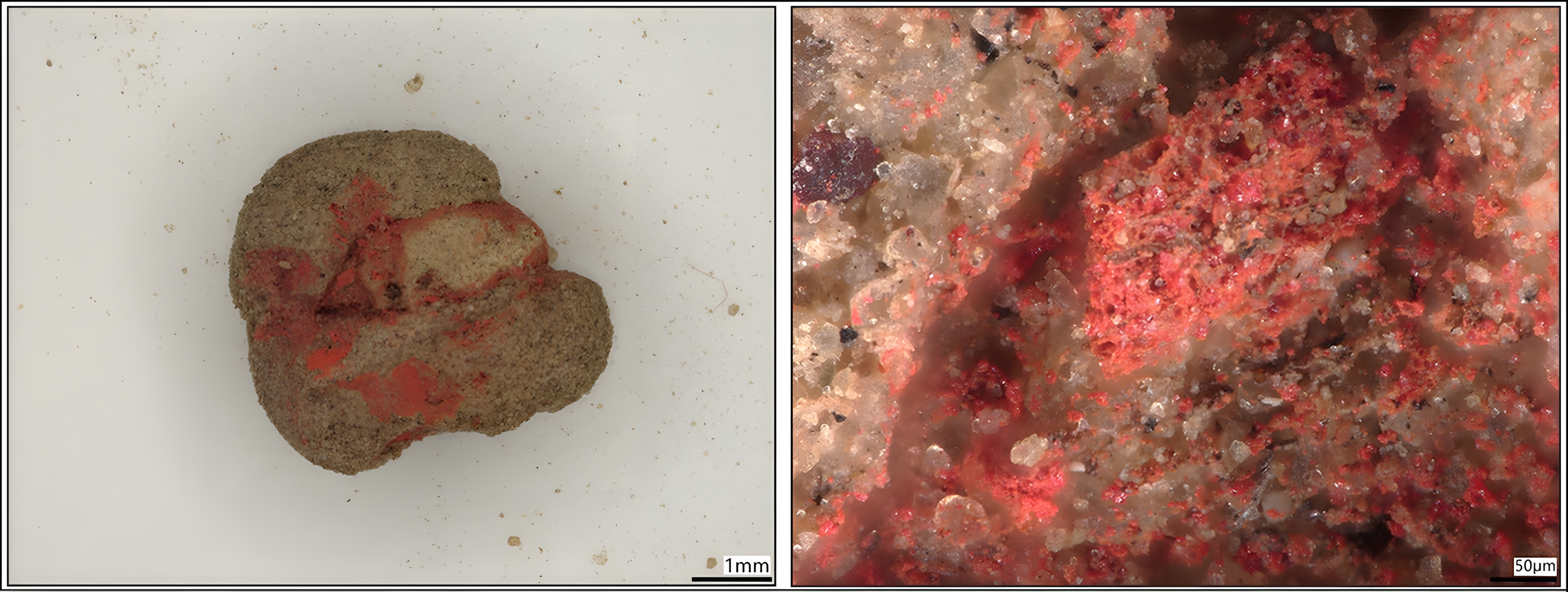 예외는 없지는 않으나, 붉은 색 안료 혹은 물감을 분석하면 두 가지로 대별하는데 하나는 사진에서 제시한 주사朱砂 계열이고 다른 하나는 산화철 계열이다. 이걸 육안으로 구별하기는 쉽지 않