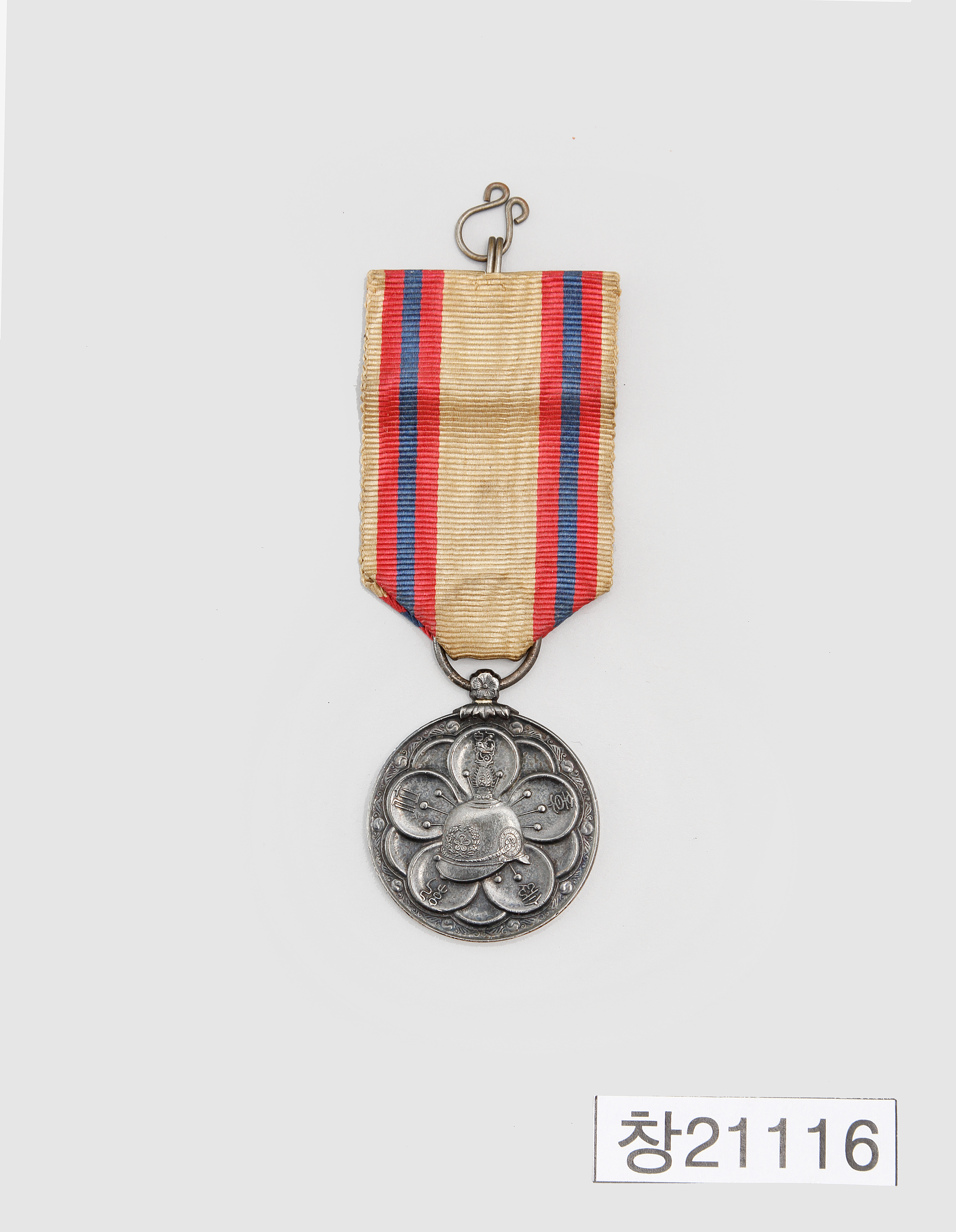 This medal was worn by civil and military officials on their official uniforms at the state event of commemorating Emperor Sunjong’s ascension to the throne in 1907. On the front side of the medal is featured a relief design of a Western-style helmet that was worn by emperors Gojong and Sunjong backed by oyat (a type of plum blossom native to Korea) that symbolized the Korean Empire. The front and side of the helmet are also adorned with oyat design. The helmet also features a bird-shaped ornament at the peak and a visor decorated in wwwwork. Adopting decorative elements that characterized Joseon helmets – jade bonghwang (a pair of mythical birds) ornament and visor with wwwwork decoration – the helmet design represents Korean Empire’s endeavor to maintain its tradition while embracing foreign elements.