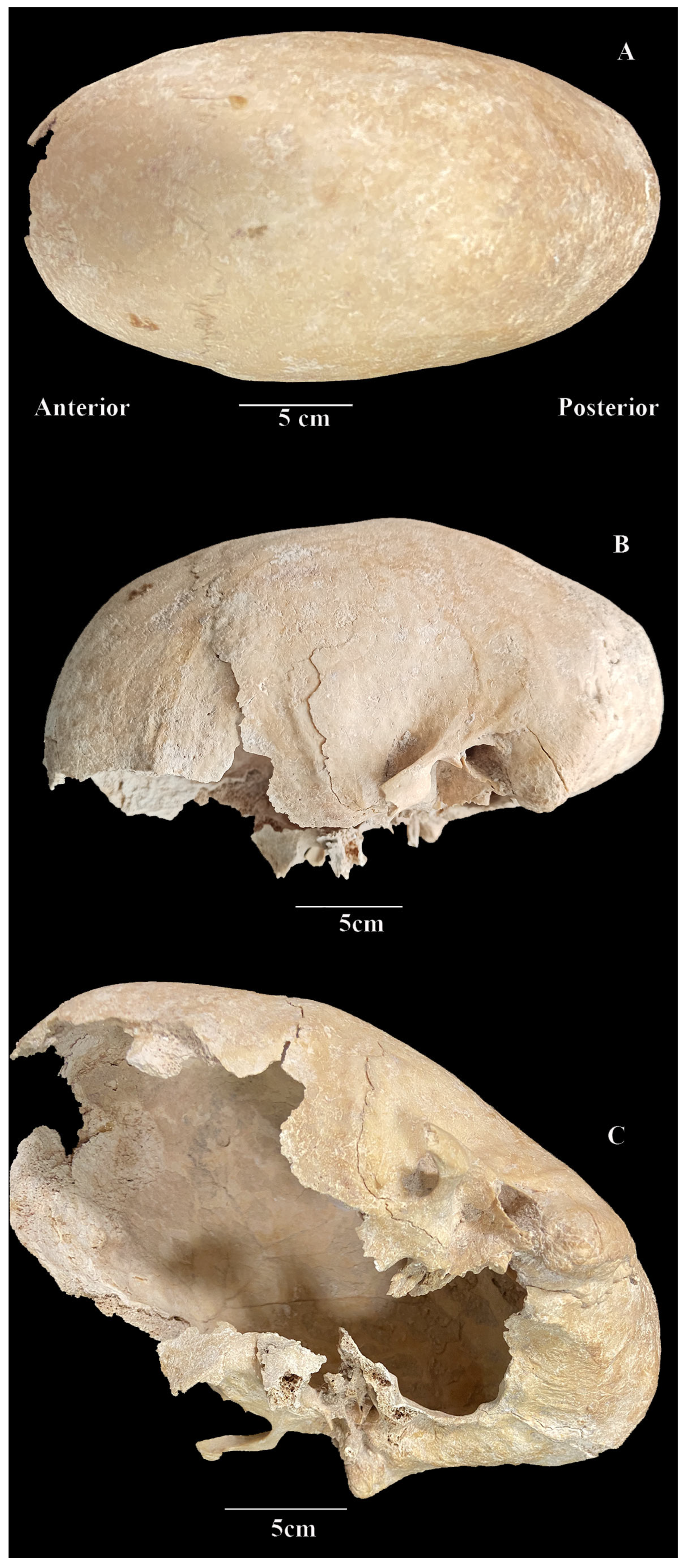 길이 23cm, 너비 12cm인 두개골은 턱 부위에 심각한 손상을 보여주는데, 이는 남성이 턱을 거의 움직이지 못하게 했을 가능성을 시사한다.