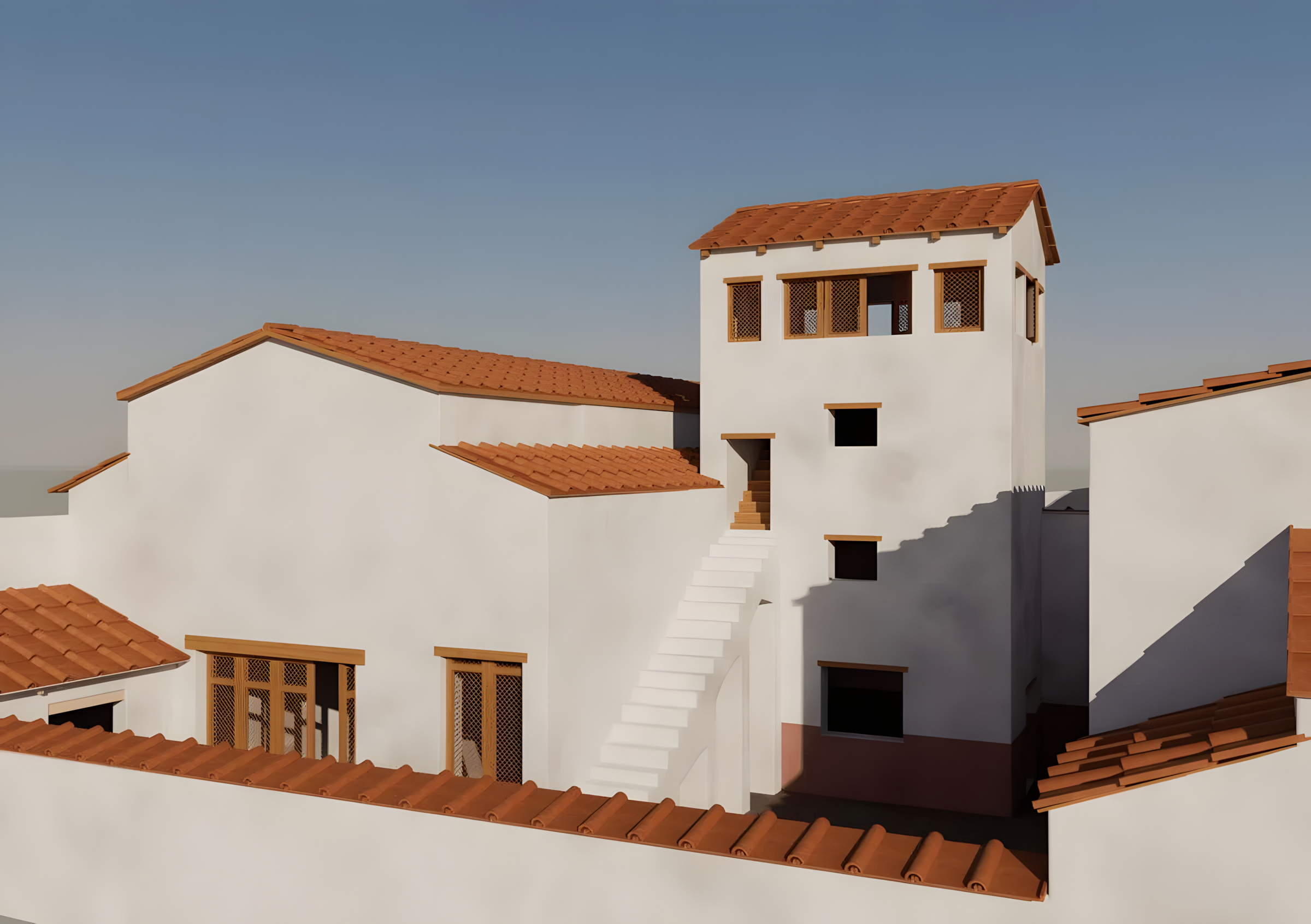 디지털 연구에 따르면, 이 가옥 웅장한 돌계단은 한때 빌라 위로 최대 12미터(40피트) 높이 높은 탑으로 이어졌다.