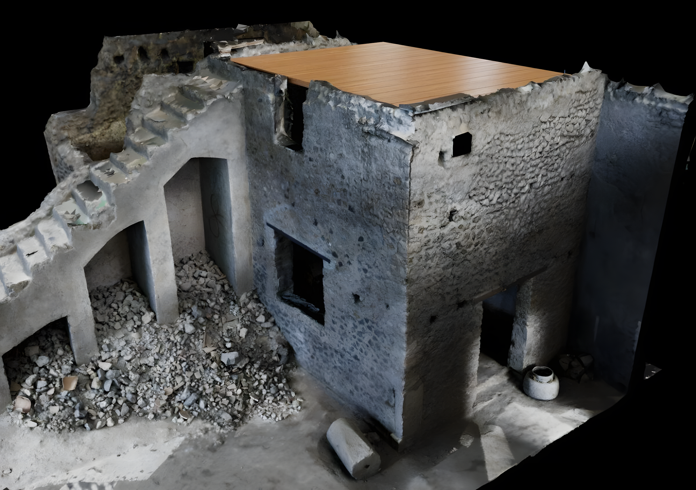들보 소켓beam sockets, 천장 잔해, 계단 배열과 같은 단서를 바탕으로 건물의 원래 모습을 재현하는 디지털 쌍둥이digital twins를 만들어낸다.