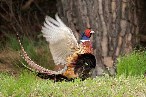 A cock pheasant is blowing its wings vigorously in a forest near Gangneung, Gangwon-do.