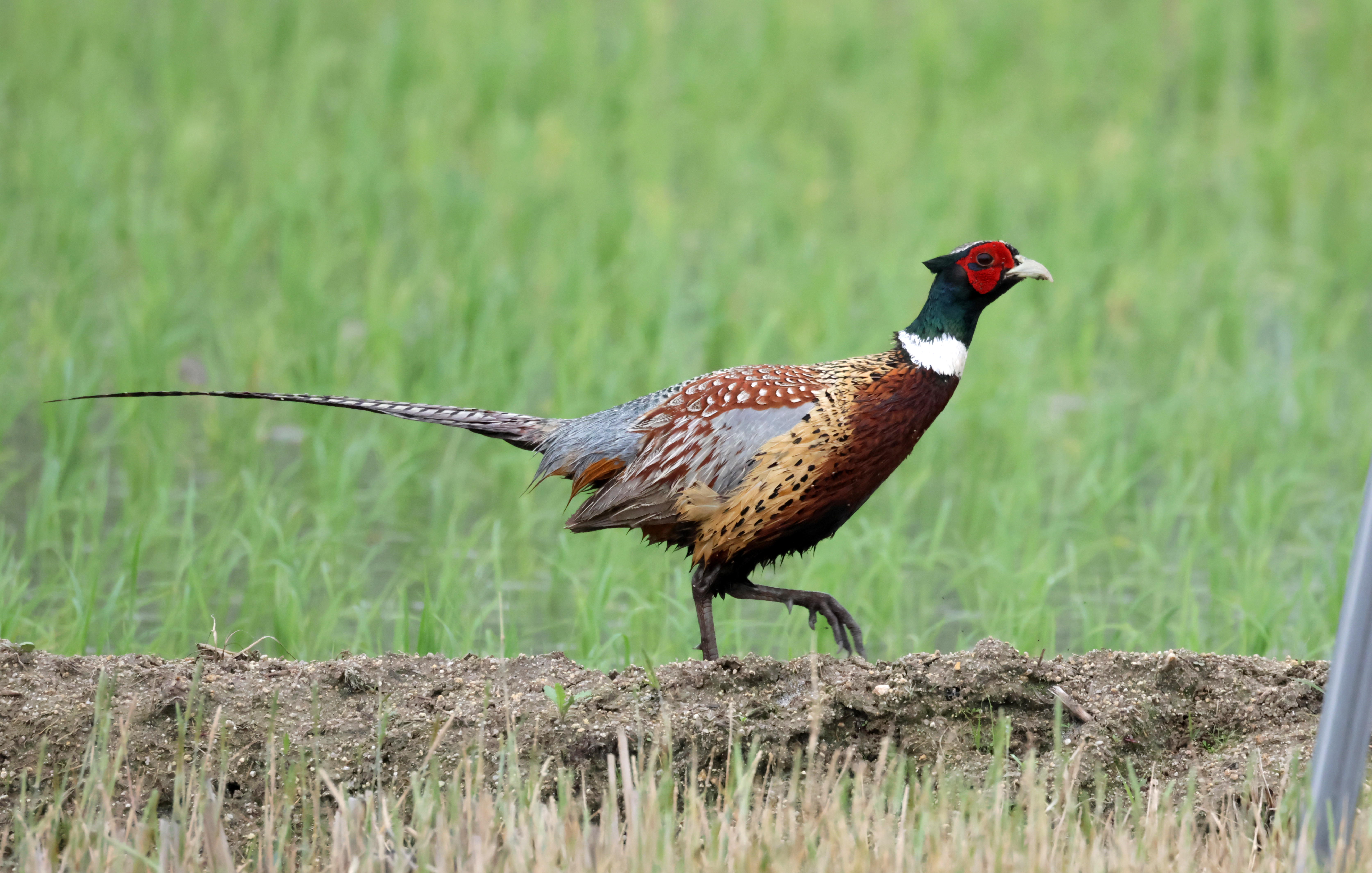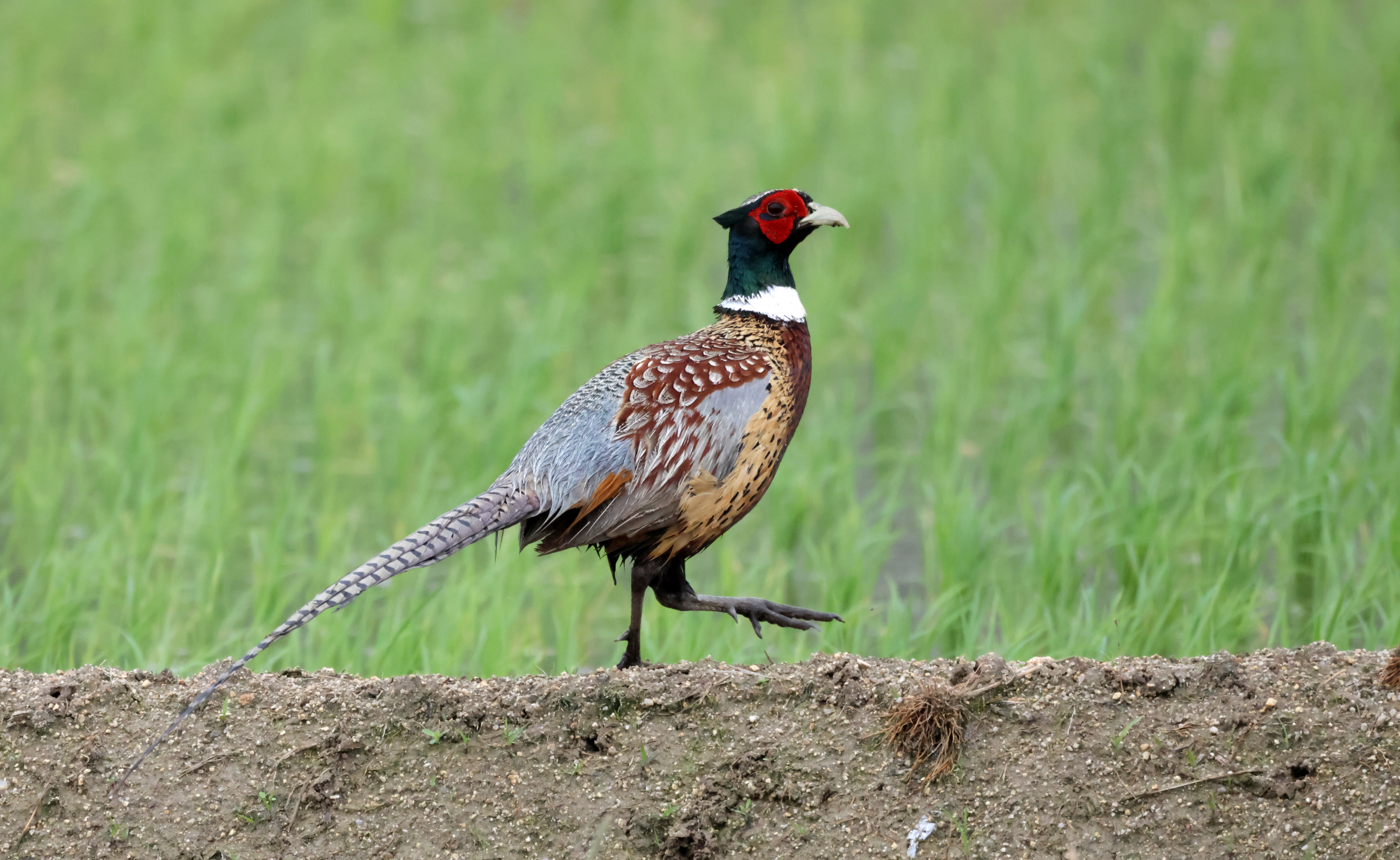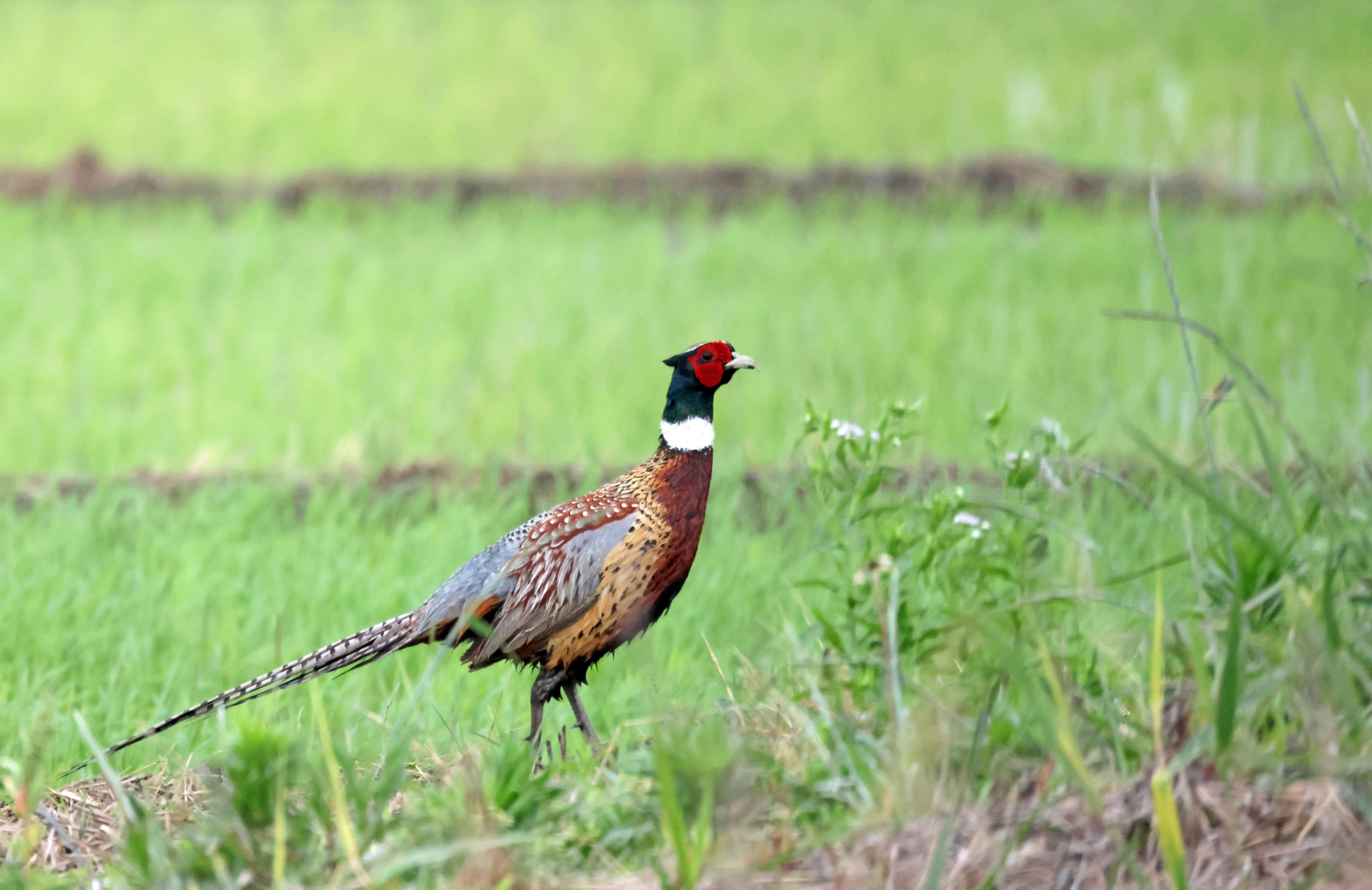 A cock pheasant strolls in a field in Gangneung, 163 kilometers east of Seoul, on May 30, 2023.