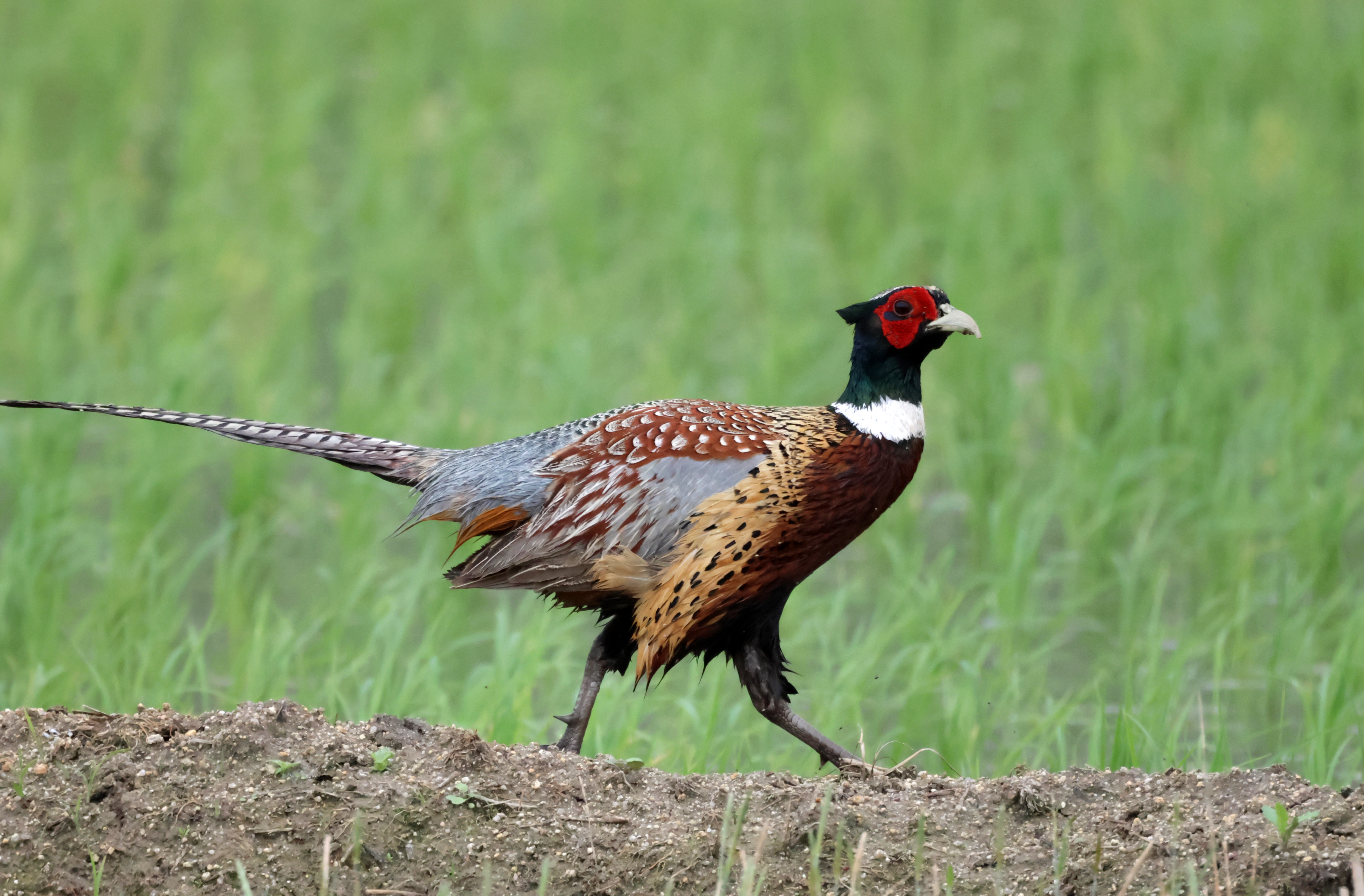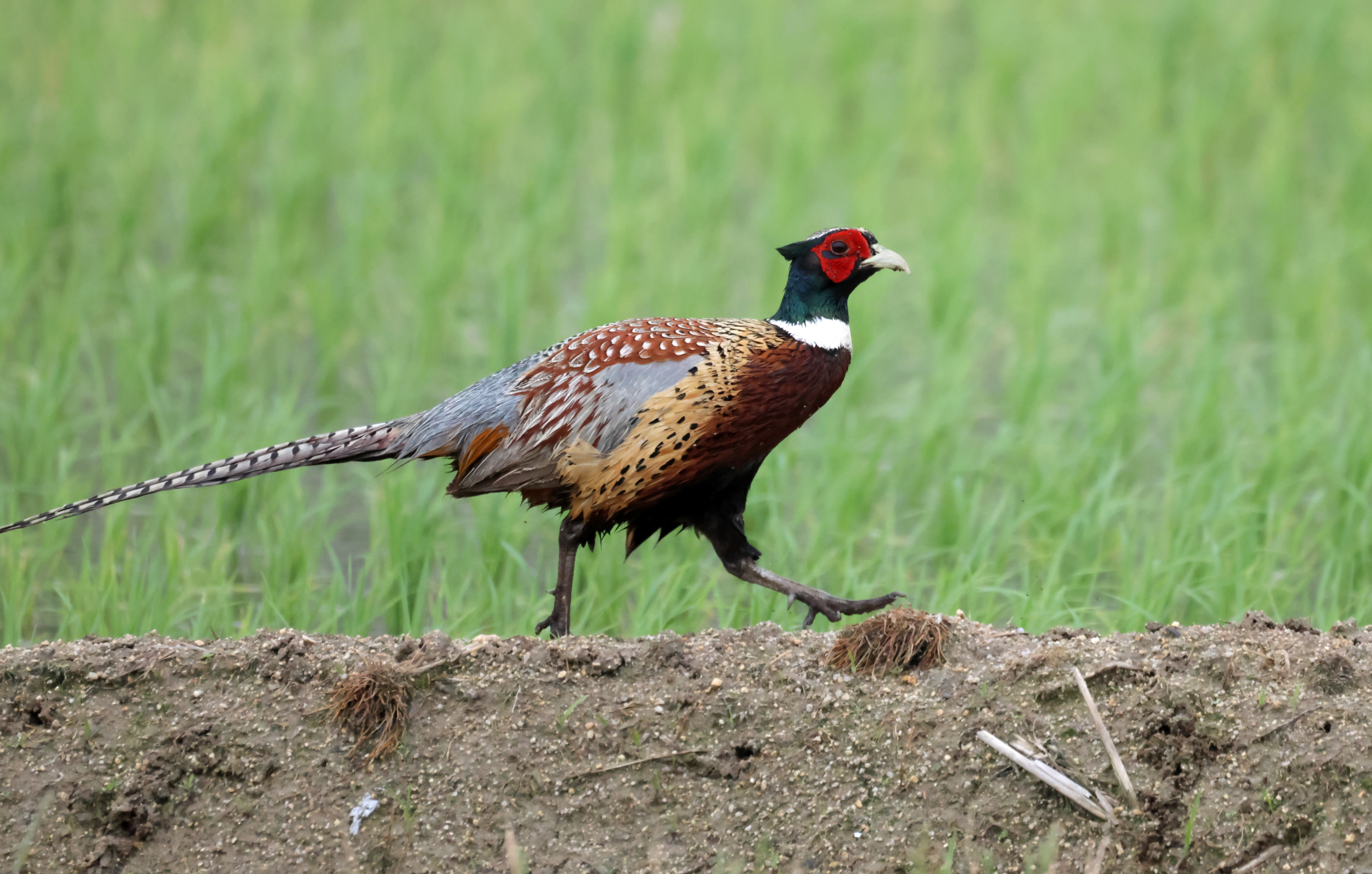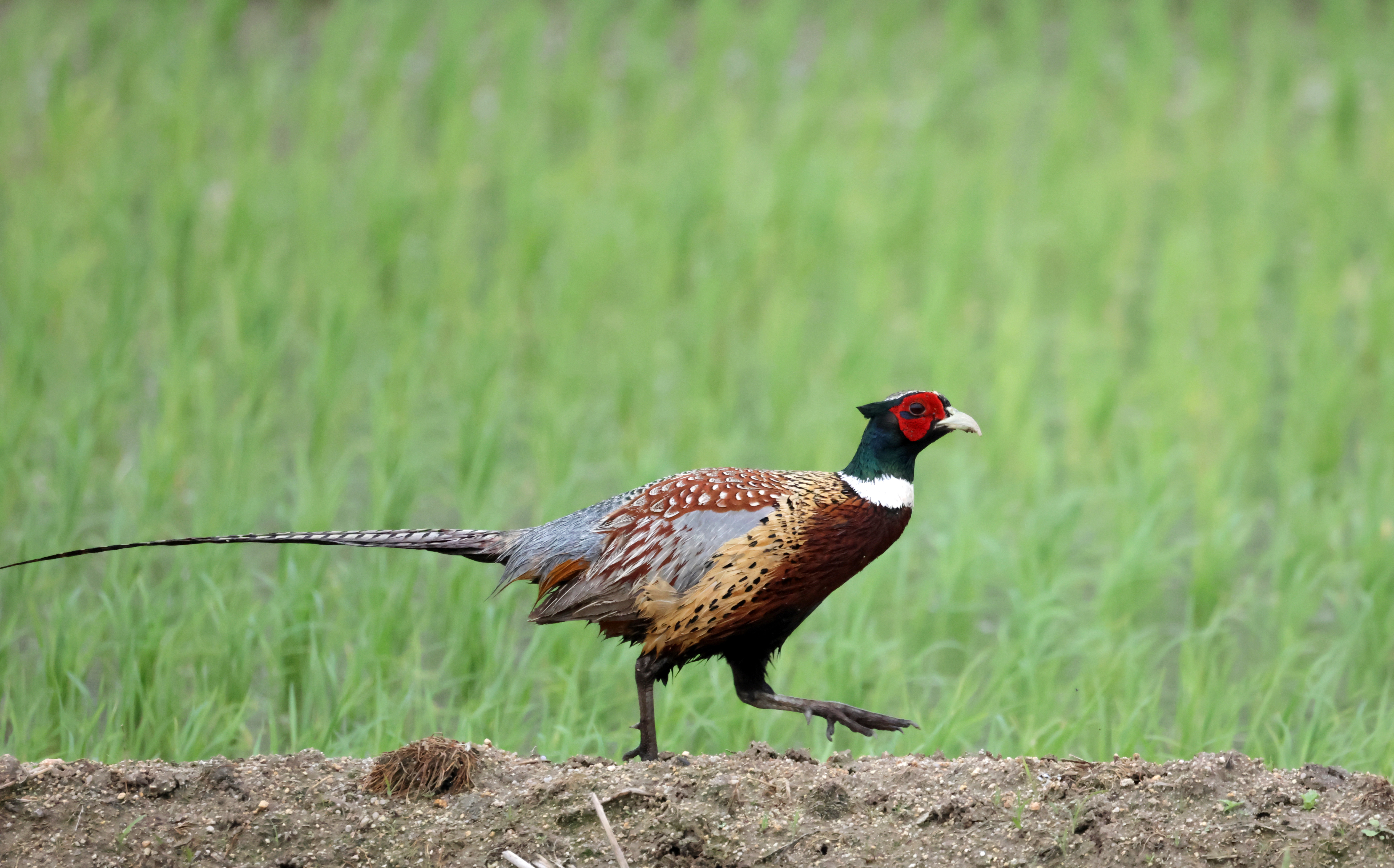 A cock pheasant strolls in a field in Gangneung, 163 kilometers east of Seoul, on May 30, 2023.