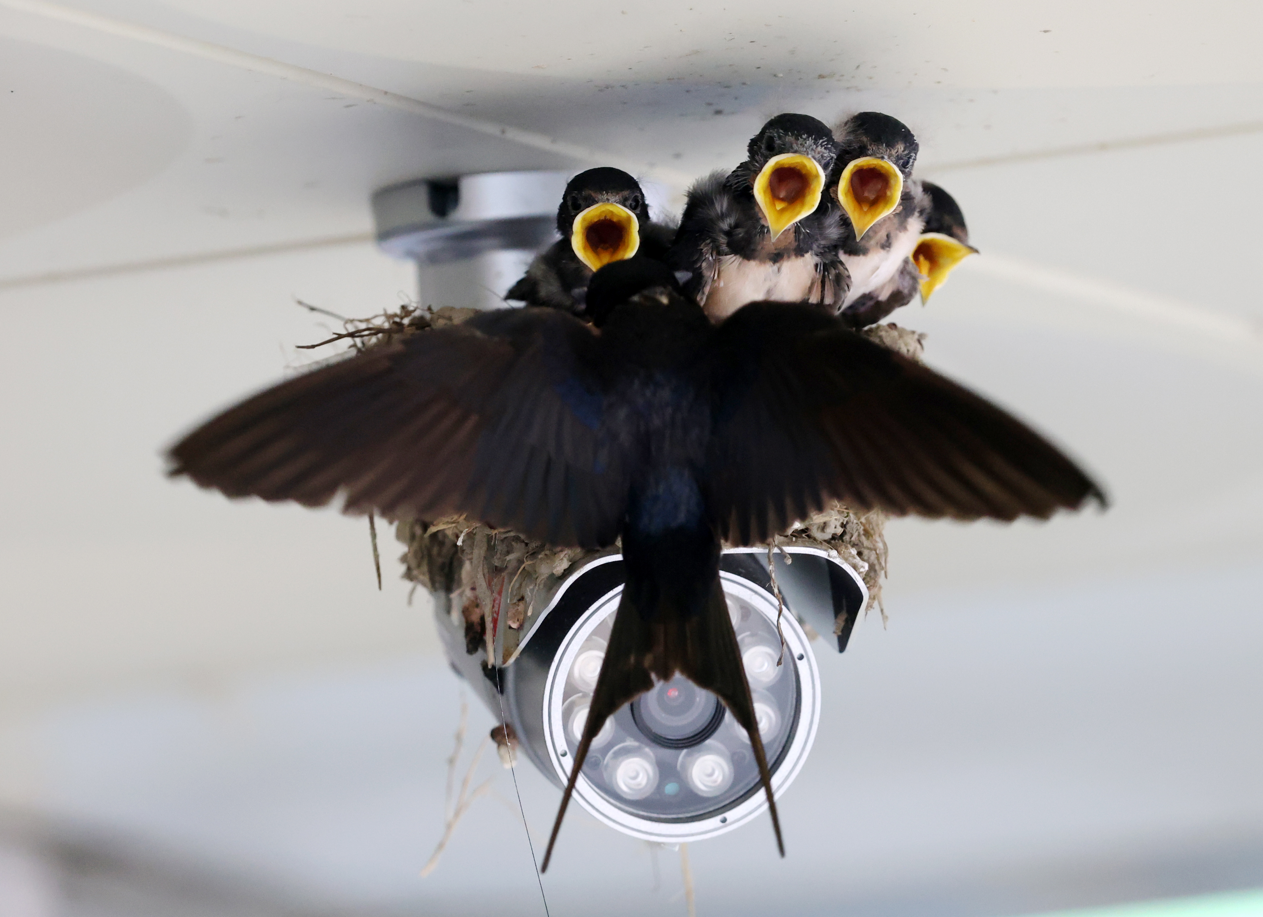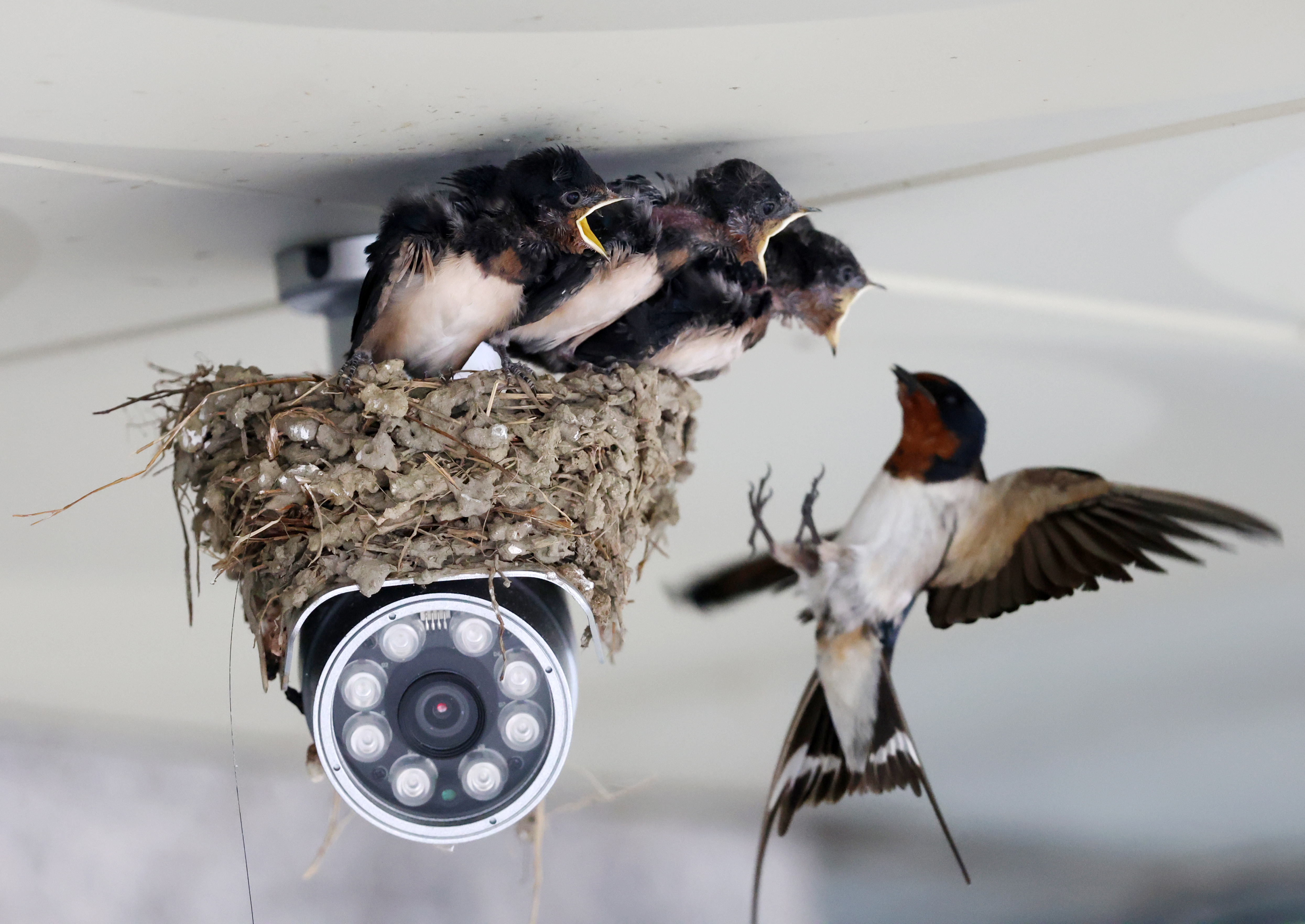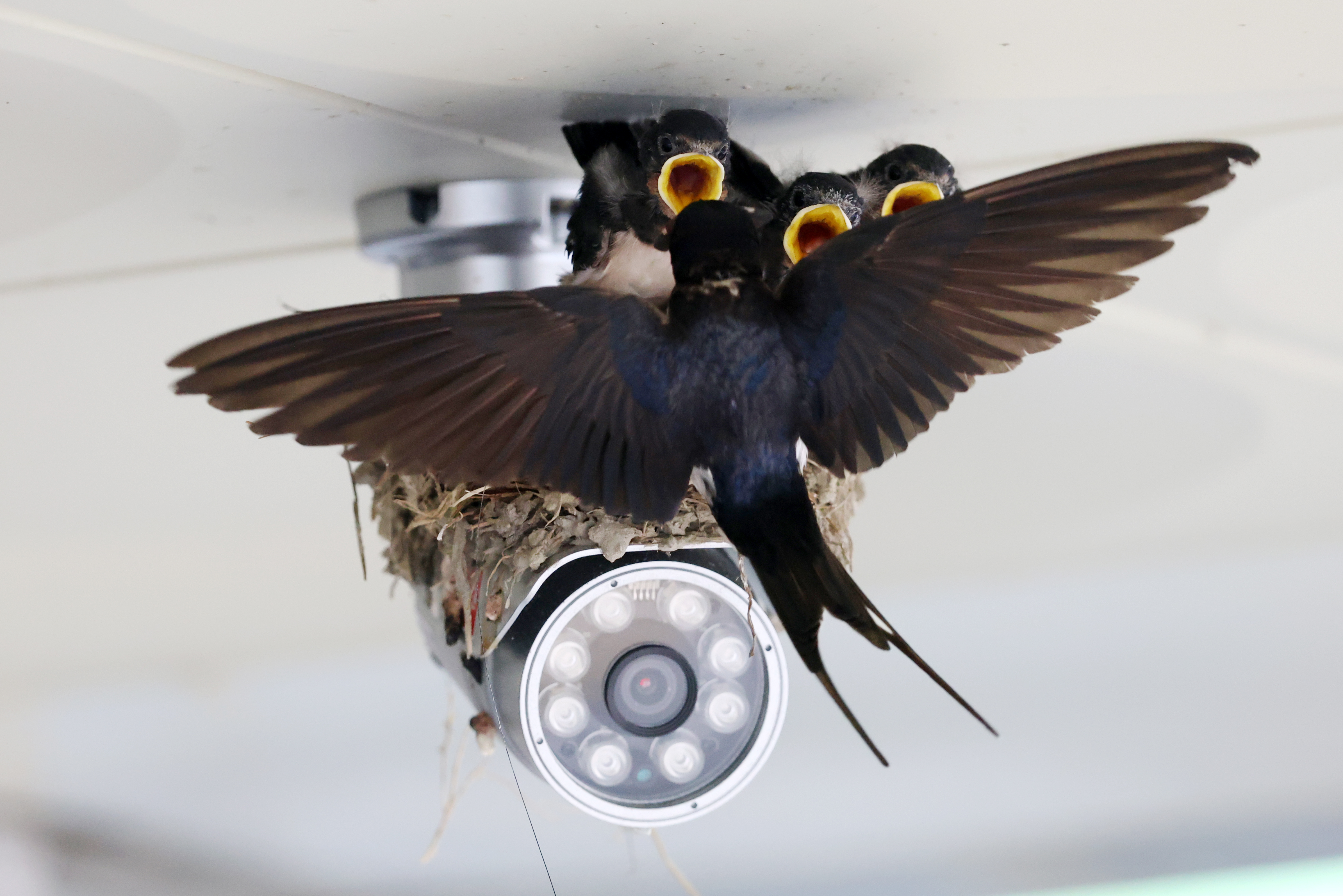 A swallow that built its nest on a CCTV camera at the entrance of the Seongsan-myeon office in Gangneung-si, Gangwon-do, is feeding his babies on the 20th.