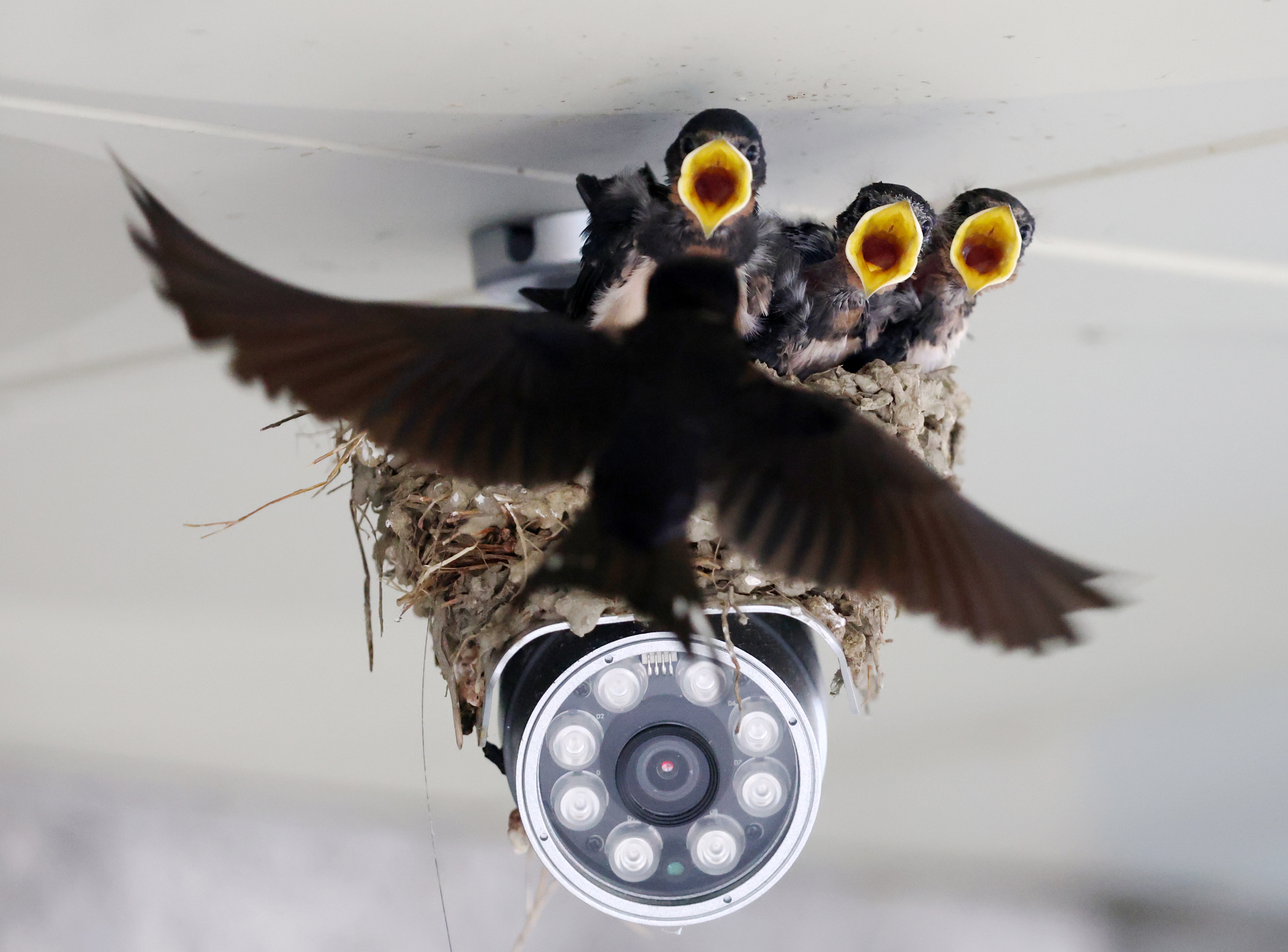 A swallow that built its nest on a CCTV camera at the entrance of the Seongsan-myeon office in Gangneung-si, Gangwon-do, is feeding his babies on the 20th.