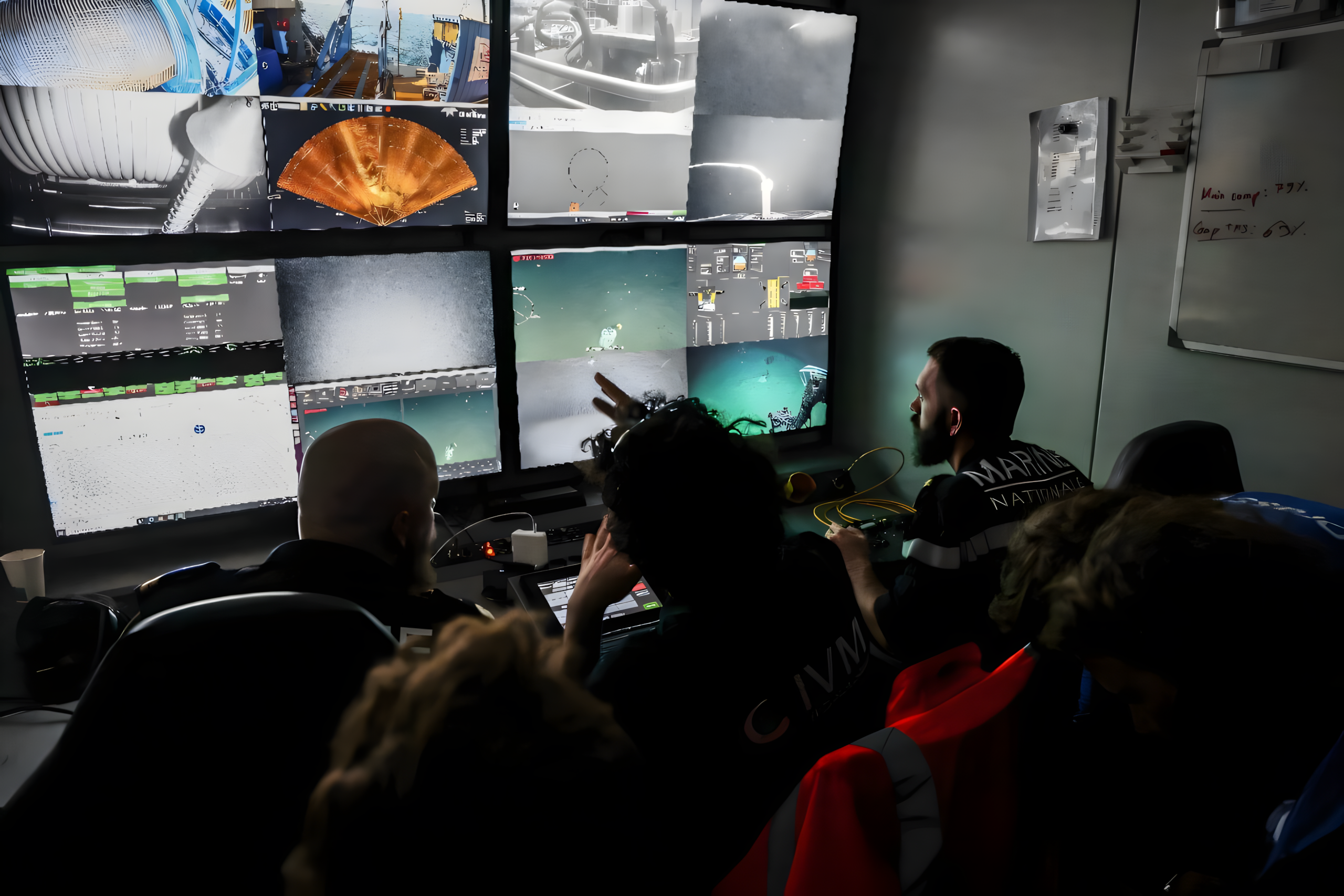 해군 장교가 긴 케이블로 배와 연결된 로봇을 조종하며 하강하는 동안, 전문가들은 화면을 통해 로봇의 느린 하강 과정을 관찰한다.