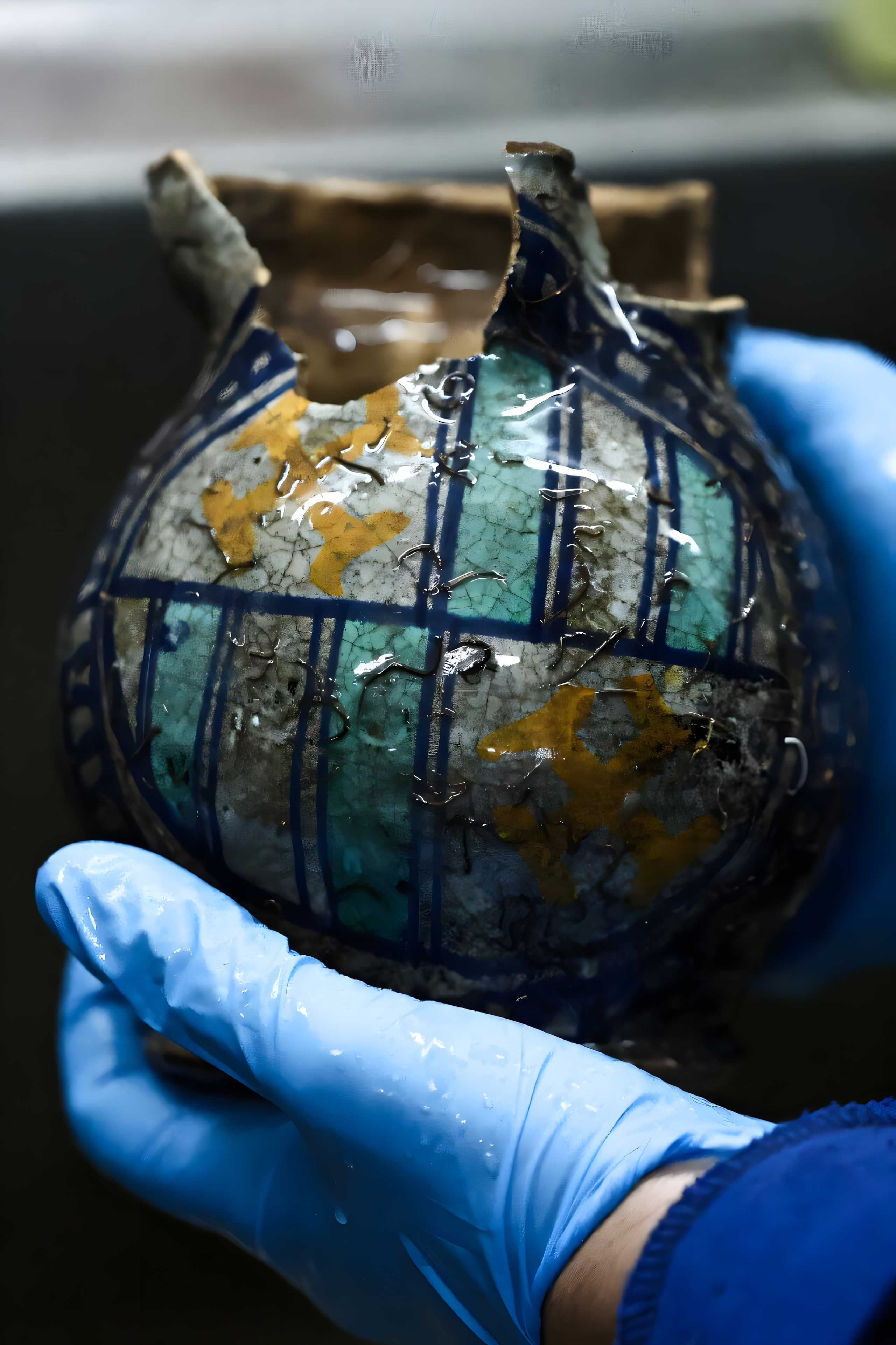 짙은 파란색 선들이 둥근 면을 가로지르며 직사각형 모양을 만들고, 그중 일부는 청록색으로 칠해져 있거나 사프란 노란색 문양으로 장식되어 있다.