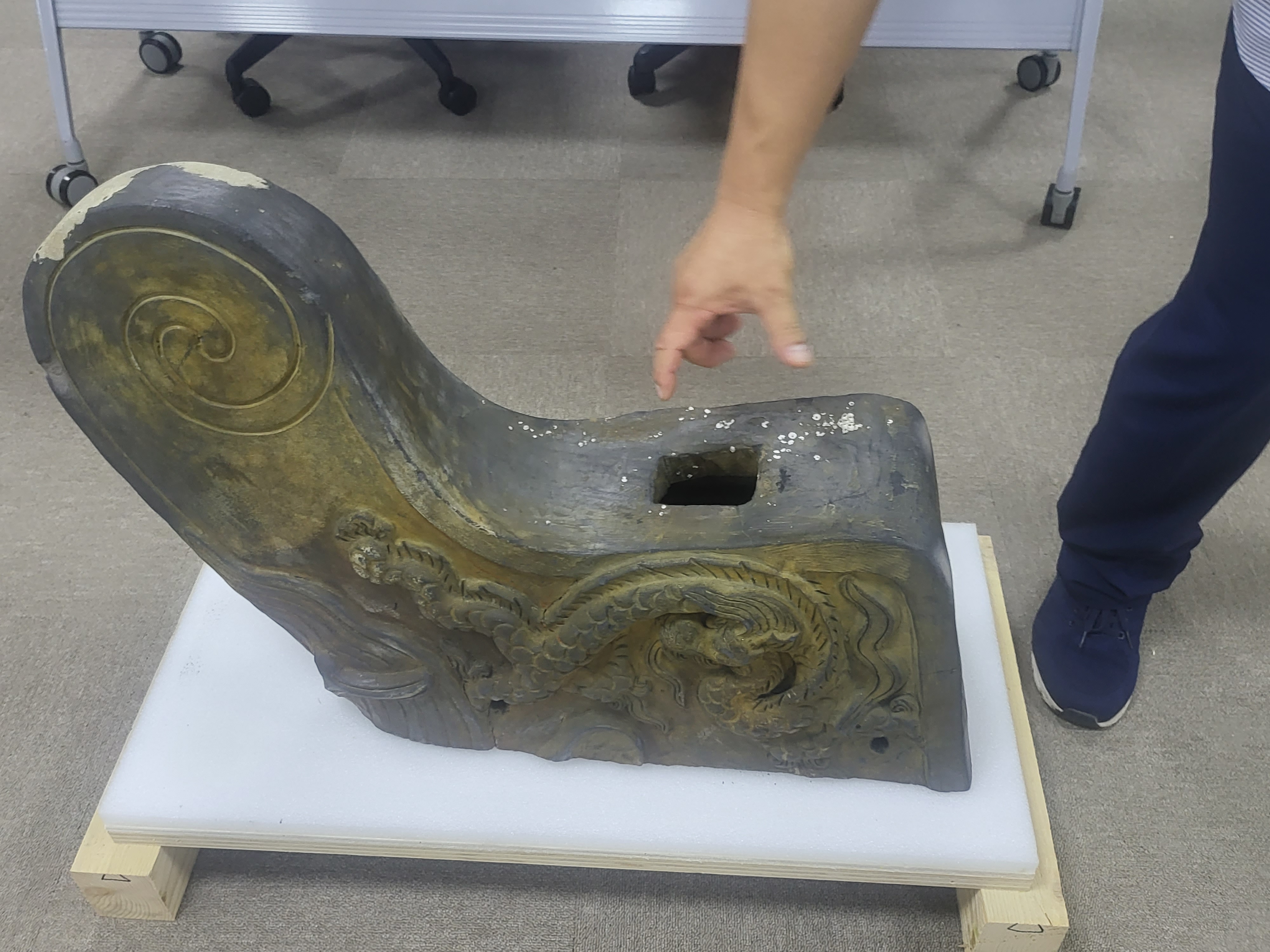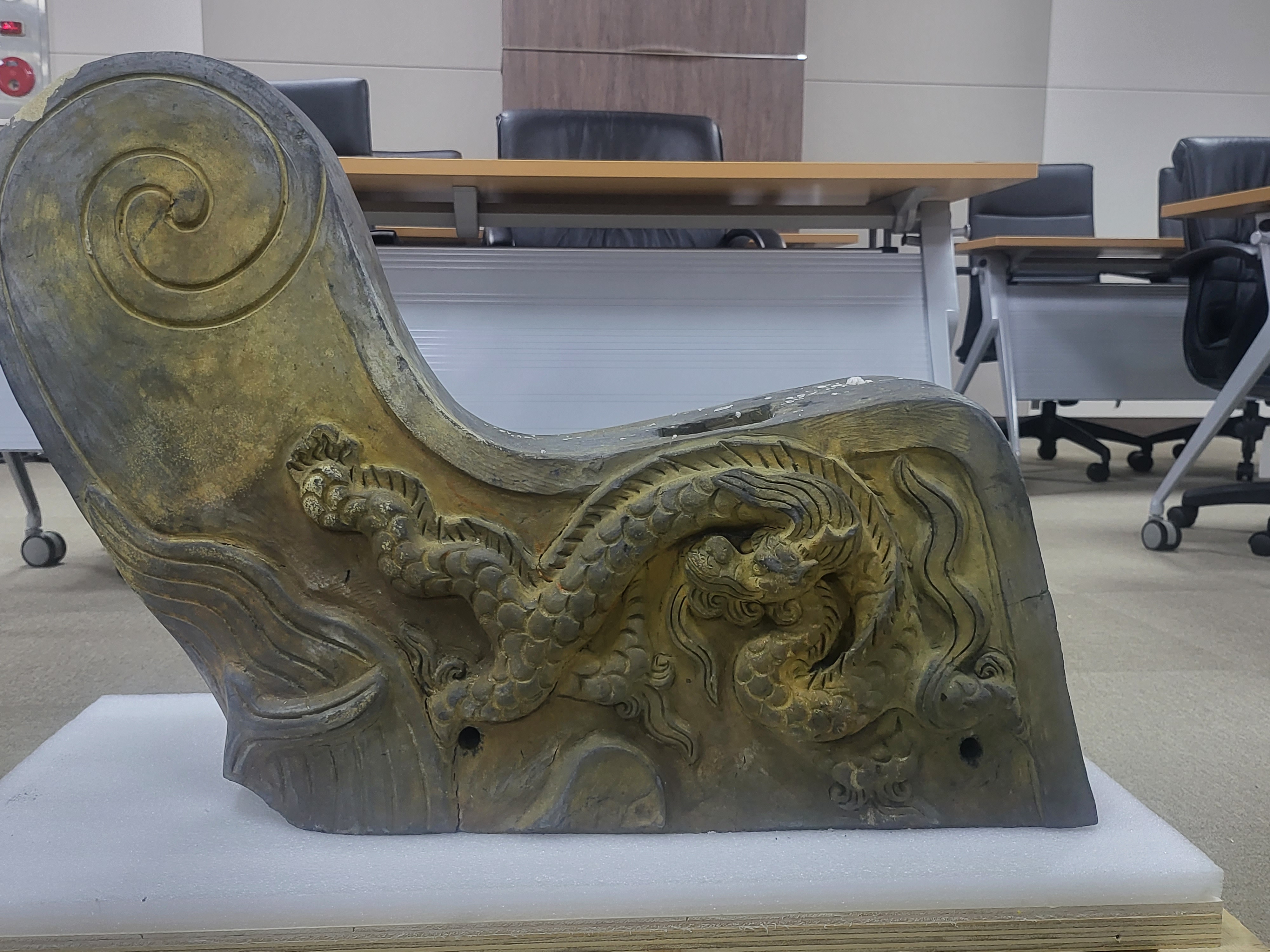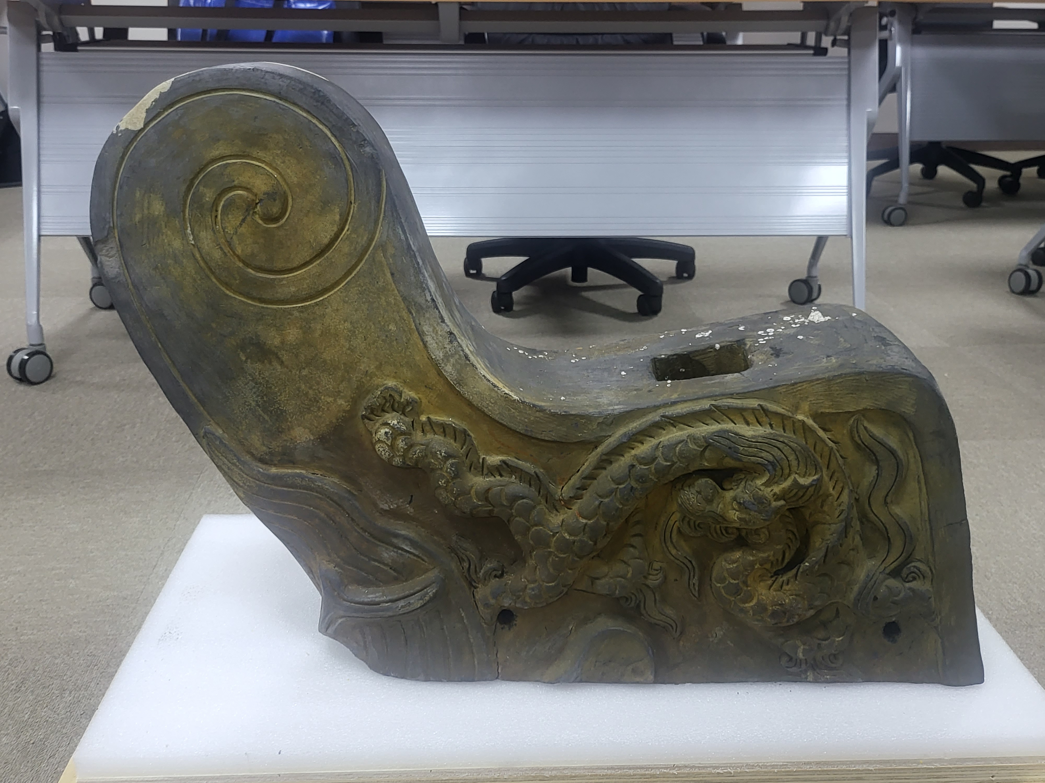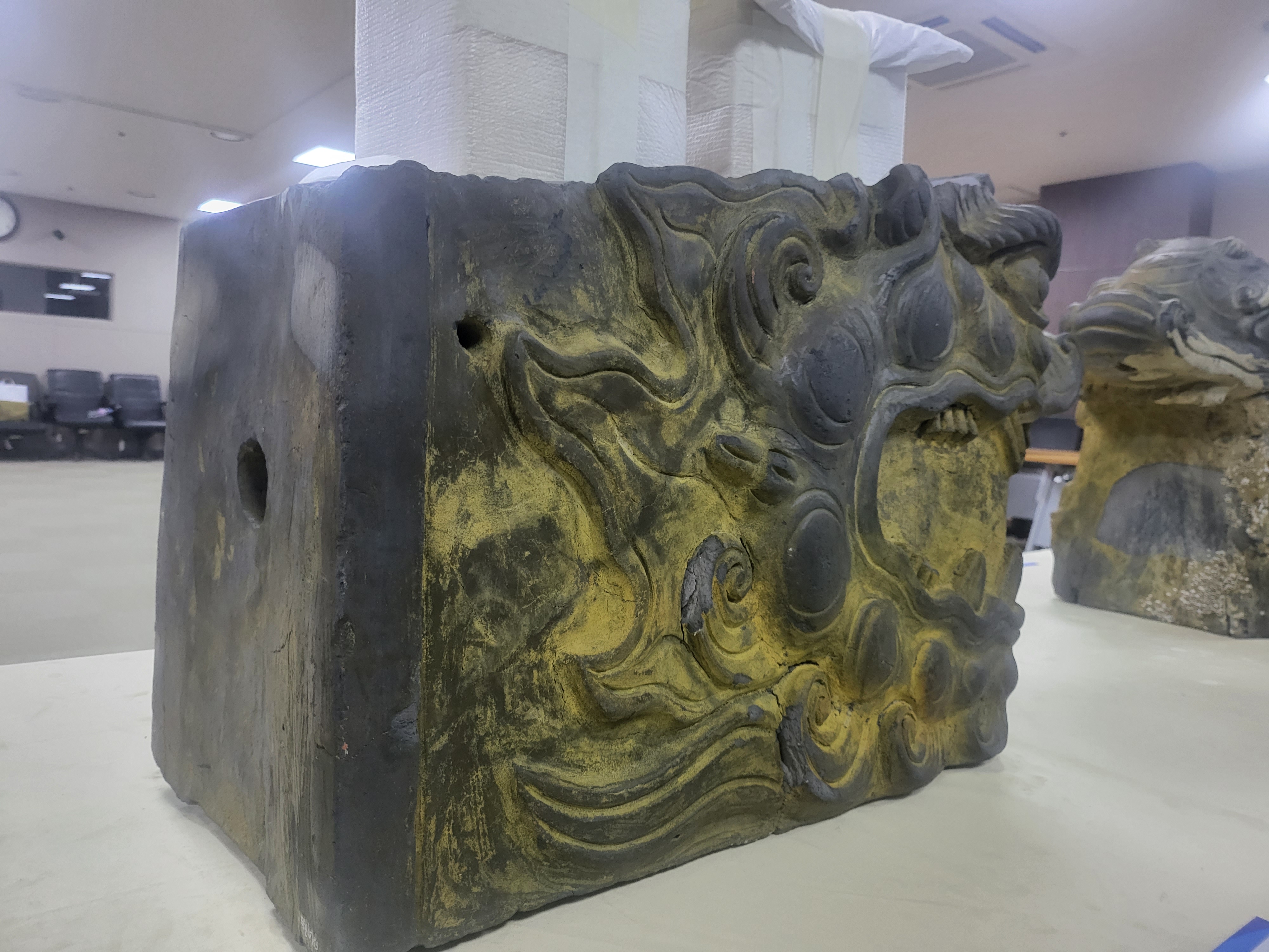 The cloud patterned Geompa excavated at this time is differed in its shape from the pattern-less simple rod type Geompa found from some dragon-headed roof tiles on the roofs of the palaces of the latter half of Joseon Dynasty, such as the Injungmun Gate at Changdukgung Palace.