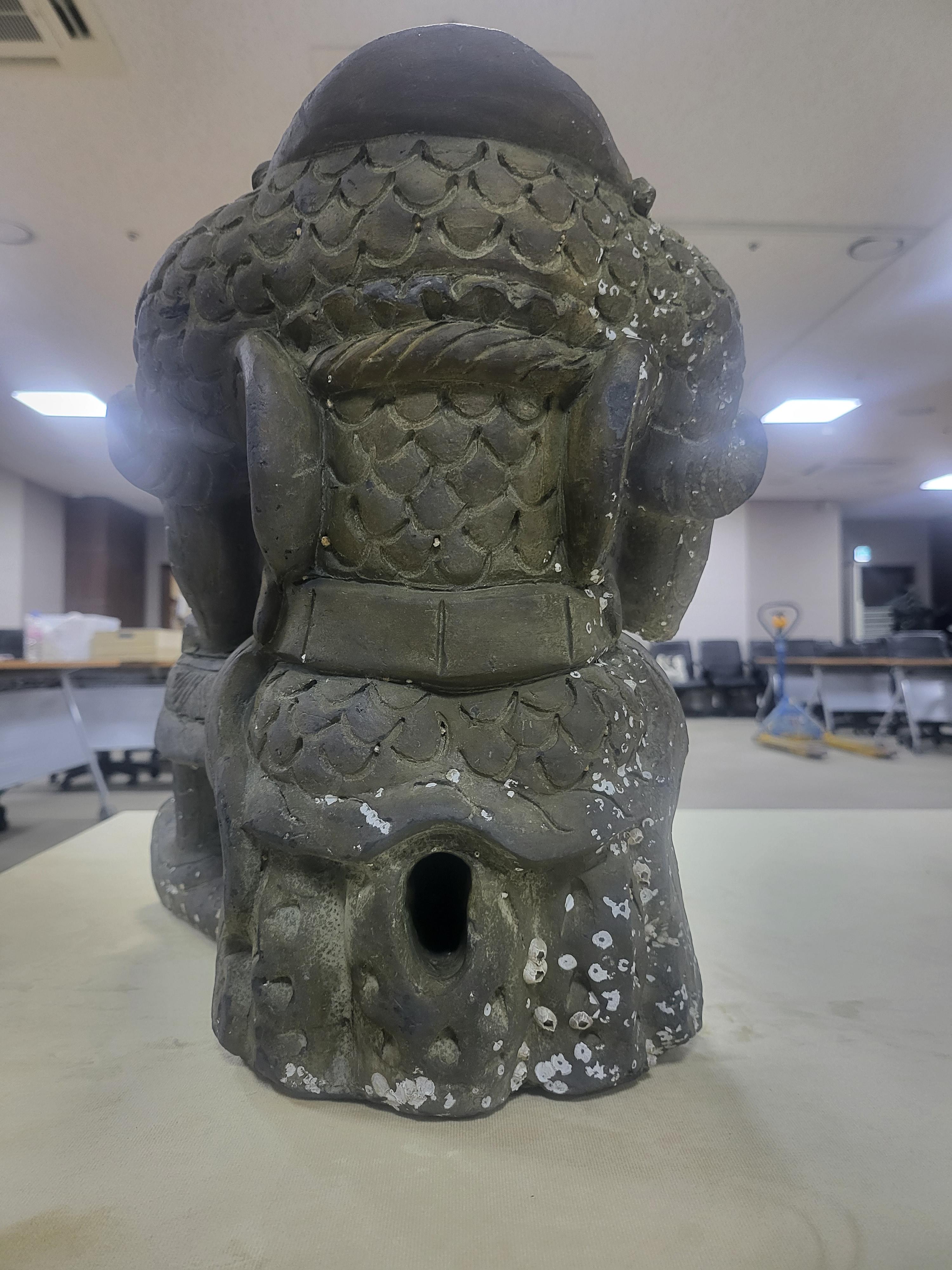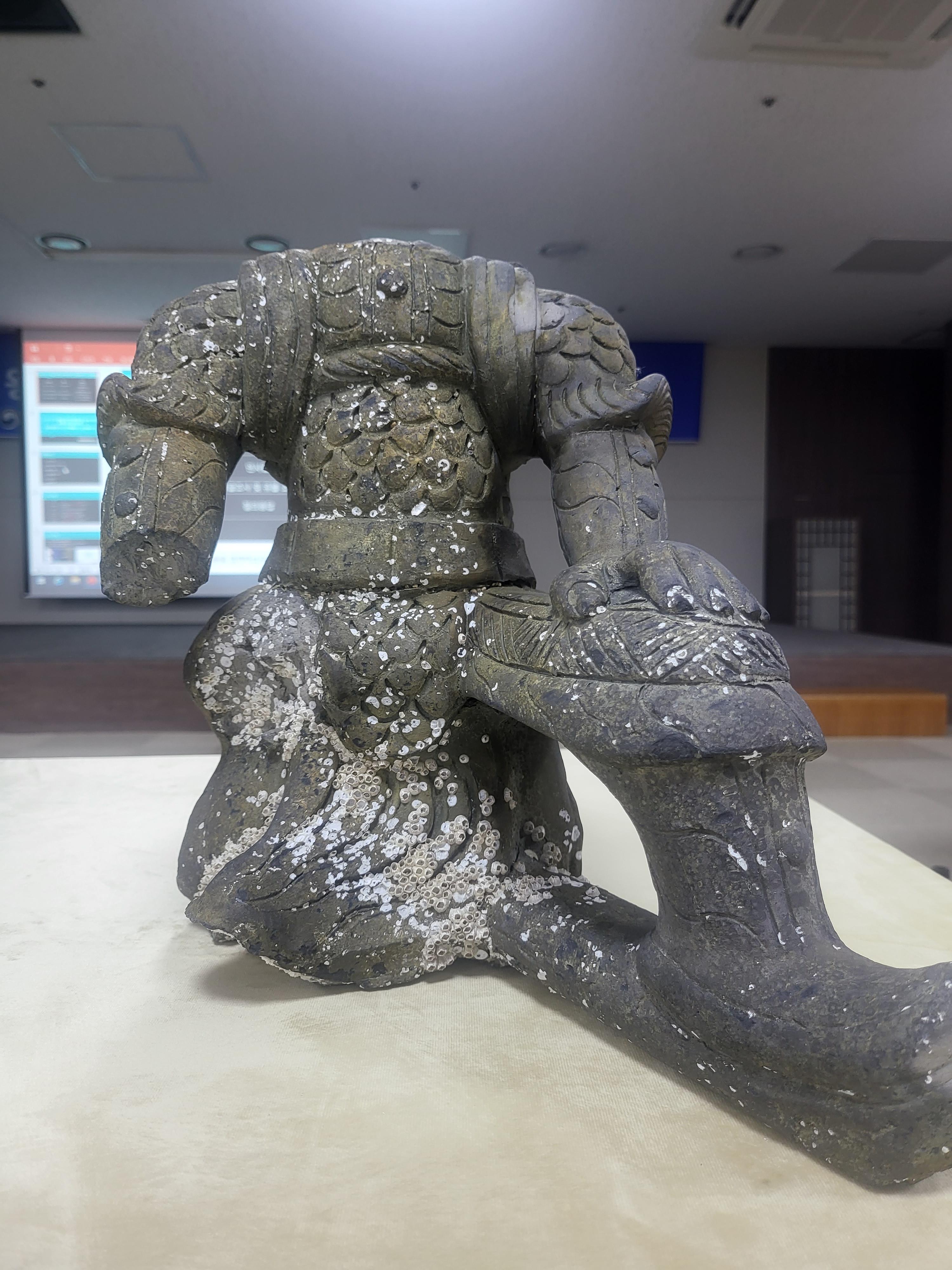 The National Research Institute of Maritime Cultural Heritage(Director, Kim YeonSoo) affiliated to Cultural Heritage Administration which surveys the proximities of the mudflats at Cheongpodae, Yangjam-ri, Taean newly discovered at the last May the upper part of the dragon-headed ornamental roof tile (Chuidu(鷲頭)) and the hilt shaped ornament, Geompa(劍把).