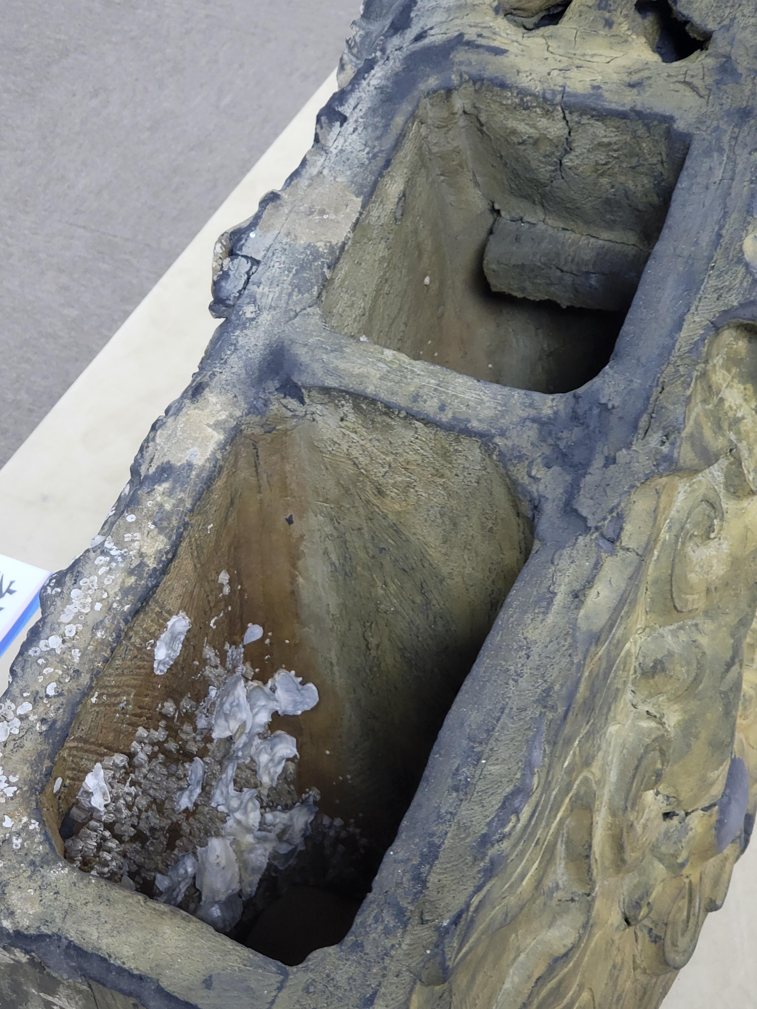 The Geompa excavated on May 2022 is hilt shaped in 40.5cm x 16cm x 7cm. The cloud patterns in two rows are expressed at the both sides and it has a short hold to be fit to the square hole on the top of the Chuidu.