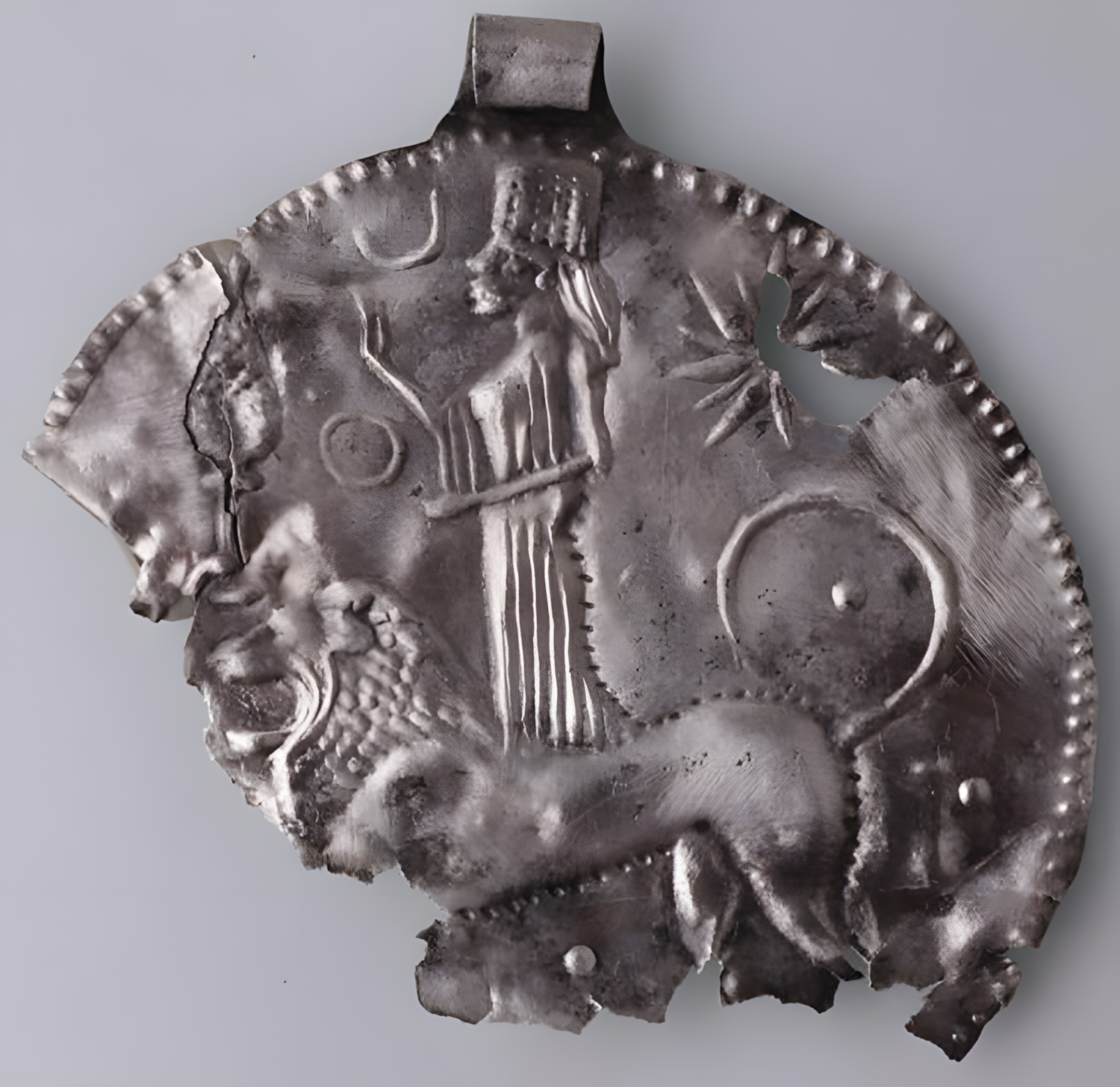 이 목걸이에는 사자 문양과 팔각별eight-pointed star을 새겼는데, 이는 고대 근동에서 사랑, 전쟁, 풍요의 여신으로 숭배받던 이슈타르를 상징하는 강력한 기호들이다.