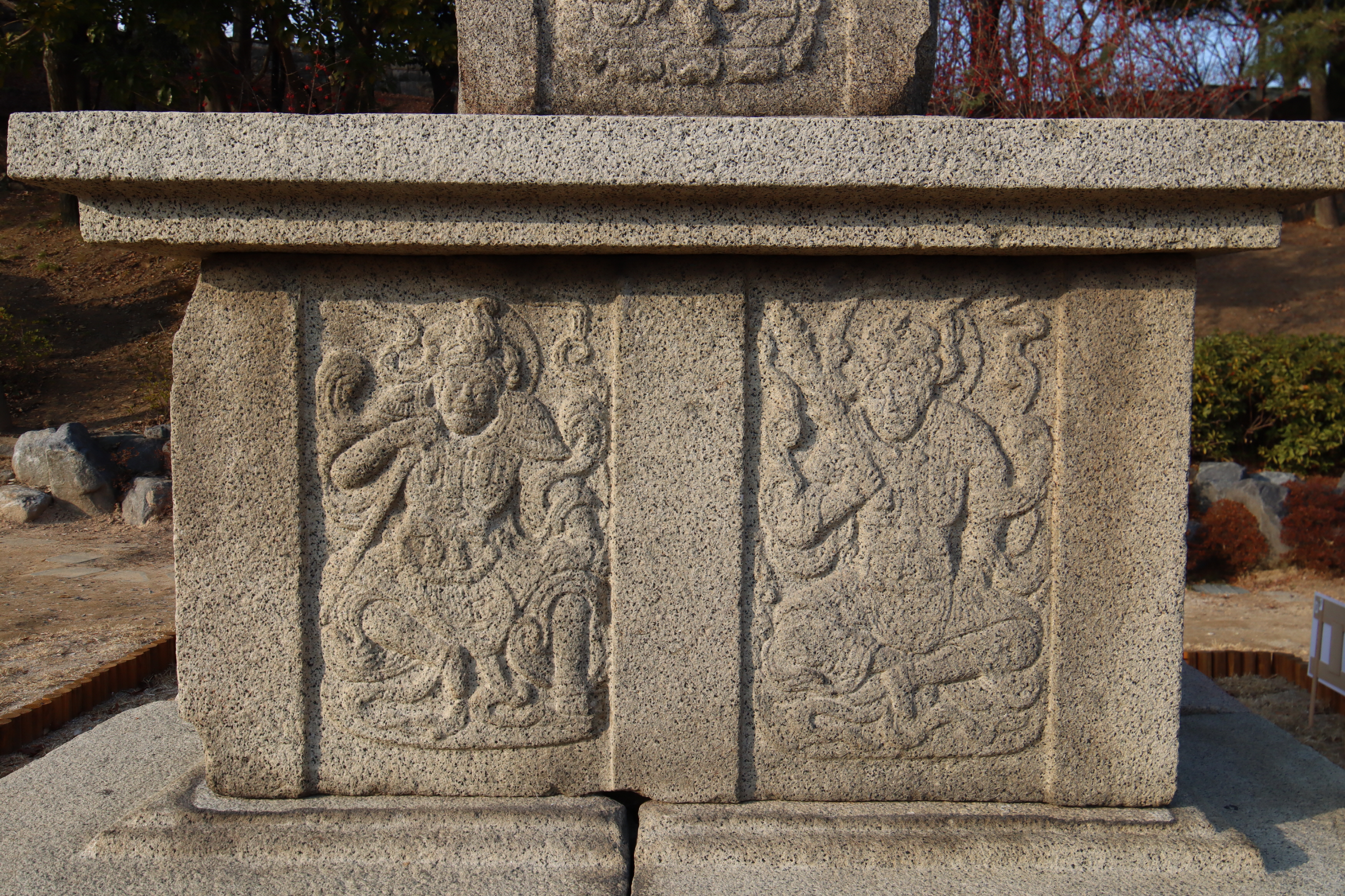 The combination of Buddhist deities and bodhisattvas is a unique feature, a significant indicator that the stone pagoda dates to 9th century Unified Silla.