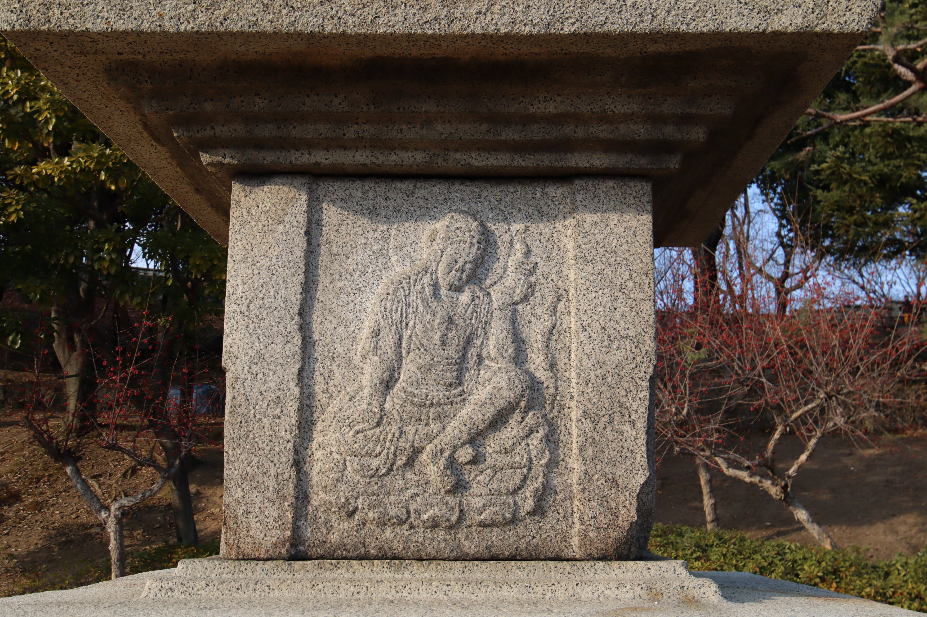 The stone pagoda's surface is carved with relief inscriptions: eight armored guardian deities of Buddhist Law carry weapons on the upper platform stone, while the first-story of the pagoda's stone body depicts four bodhisattvas with one in the middle facing forward.
