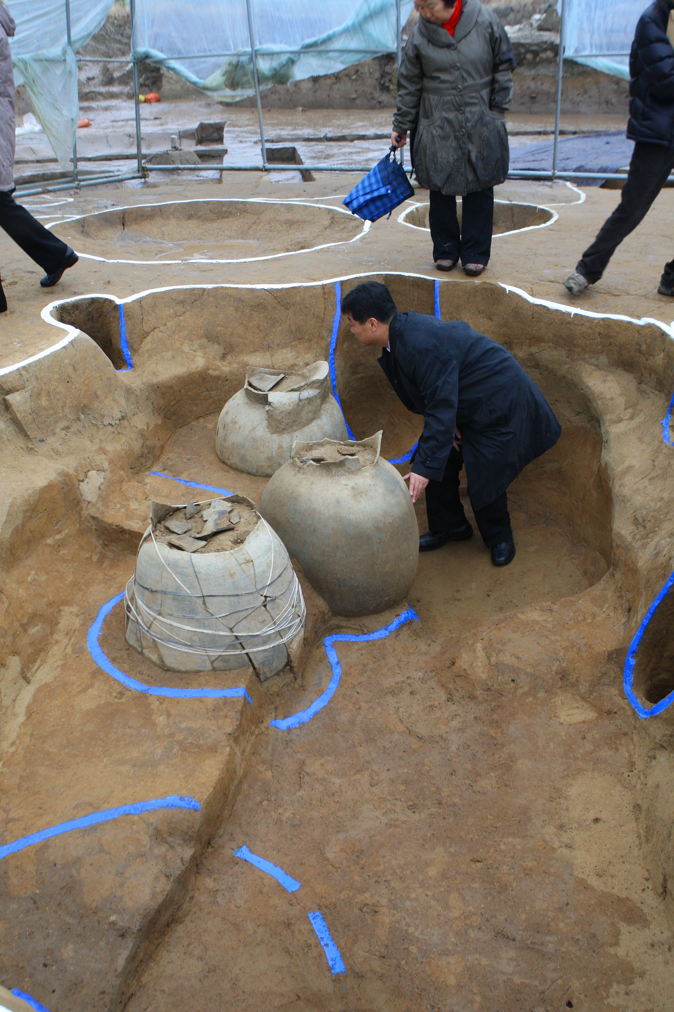 Those three jars were found inside a pit from the Hanseong Baekje period. The pit with a rectangular planar shape is thought to be a warehouse site. A celadon bowl made in China around the mid-5th century was excavated from one of the jars.