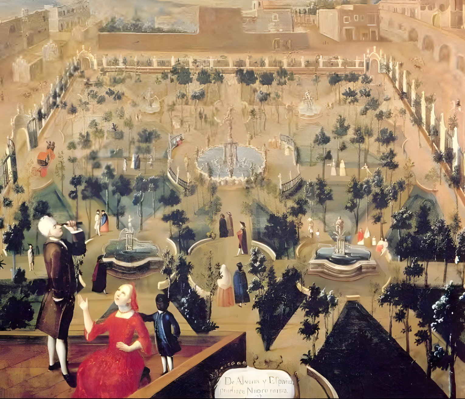 멕시코시티에 있는 산타 이사벨 수도원Convent of Santa Isabel 그림. 18세기 작(작가 미상). 현재 이 건물은 미술관으로 사용되고 있다. 그림 전경에는 수도원 지붕 위에 한 가족이 묘사된다. 출처: Velázquez A. 2004. La colección de pintura del Banco Nacional de México. Catálogo, Siglo XIX, México, Fomento Cultural Banamex, 2 V.