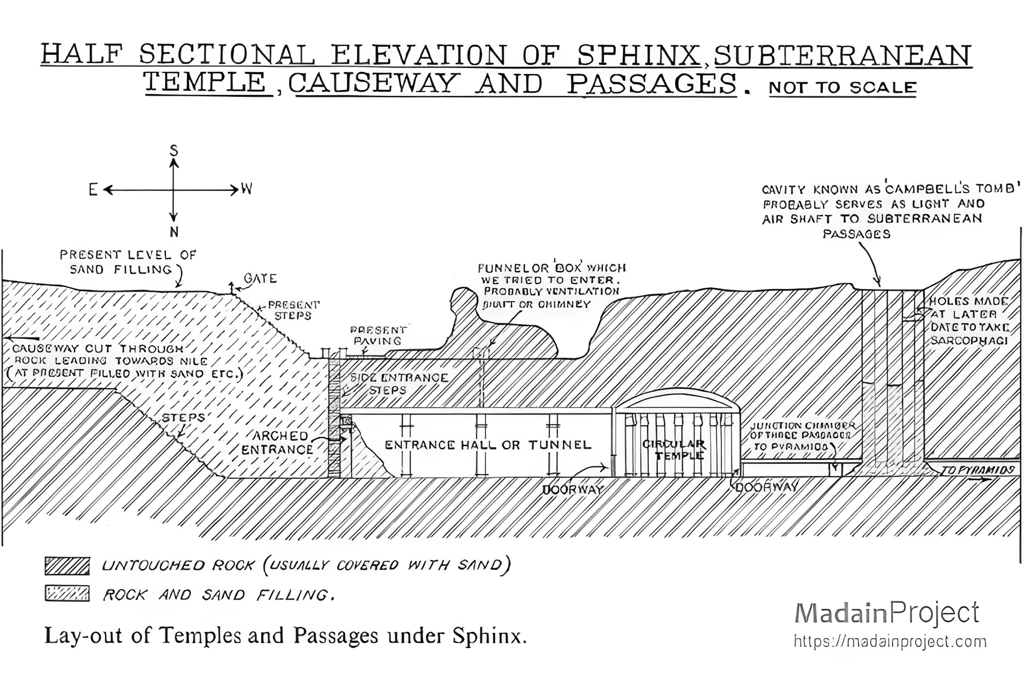 1929년과 1939년 사이에 저명한 학자 조지 라이스너George Reisner, 헤르만 융커Hermann Junker, 셀림 하산Selim Hassan은 스핑크스와 카프레 피라미드 사이에 있는 공동을 추적했다. 그들의 조사 이후, 이 지역은 지금까지 거의 잊혔다.