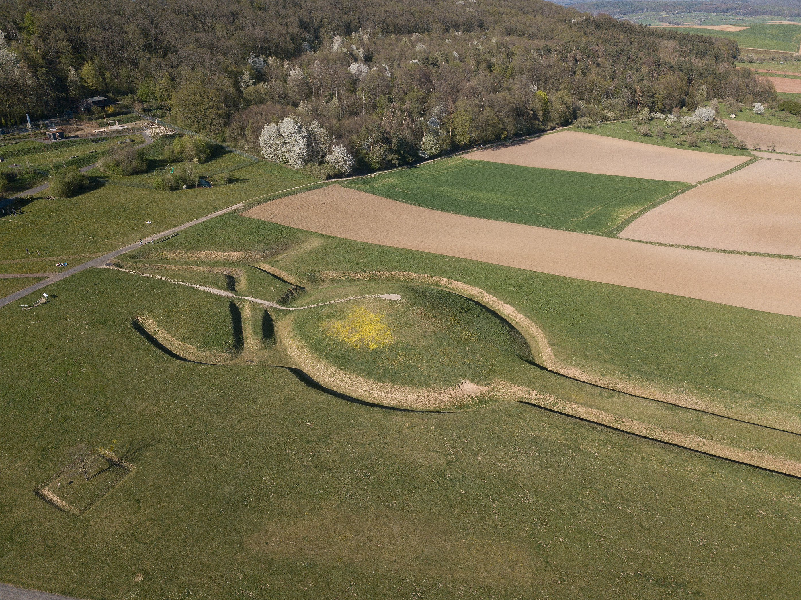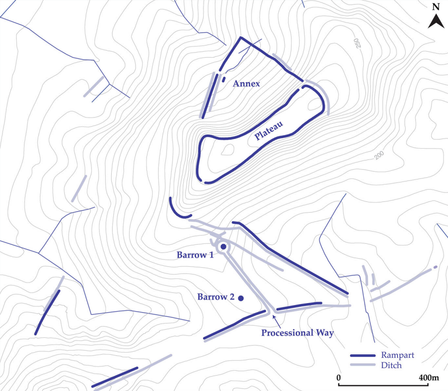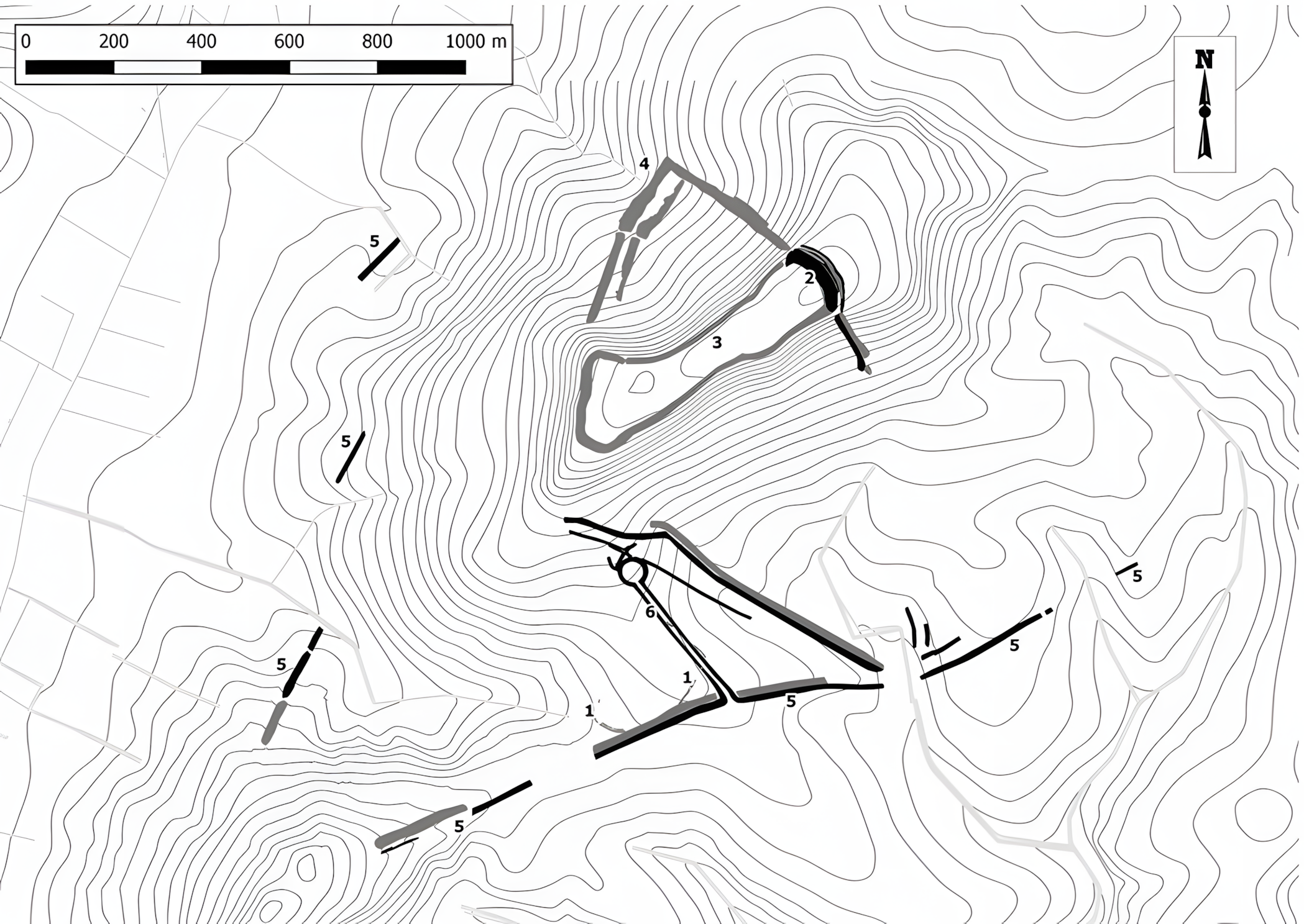 Map of the Glauberg with its various fortification systems. 1: Middle Neolithic (Rössen Culture) ditch; 2: Late Bronze Age (Urnfield Culture) promontory wall; 3: Iron Age (Late Hallstatt and Early Latène) wall surrounding the plateau; 4: Iron Age (Early Latène) annexe wall; 5: Iron Age (Early Latène) ditch/rampart system; 6: Iron Age (Early Latène) 'processional avenue' (map: A. G. Posluschny, contour lines based on Mainz University surveys).