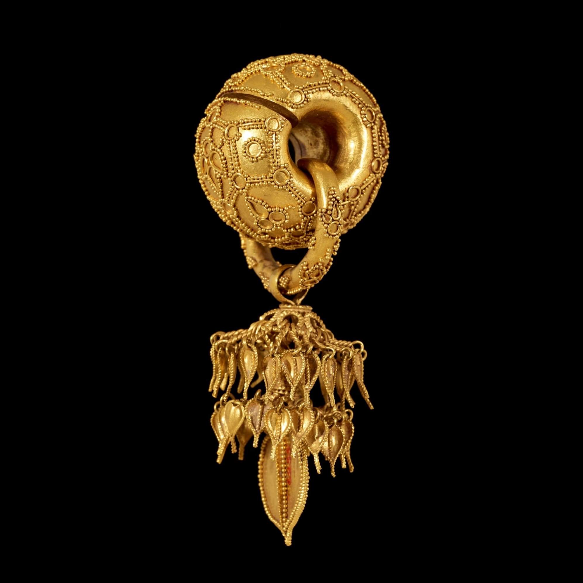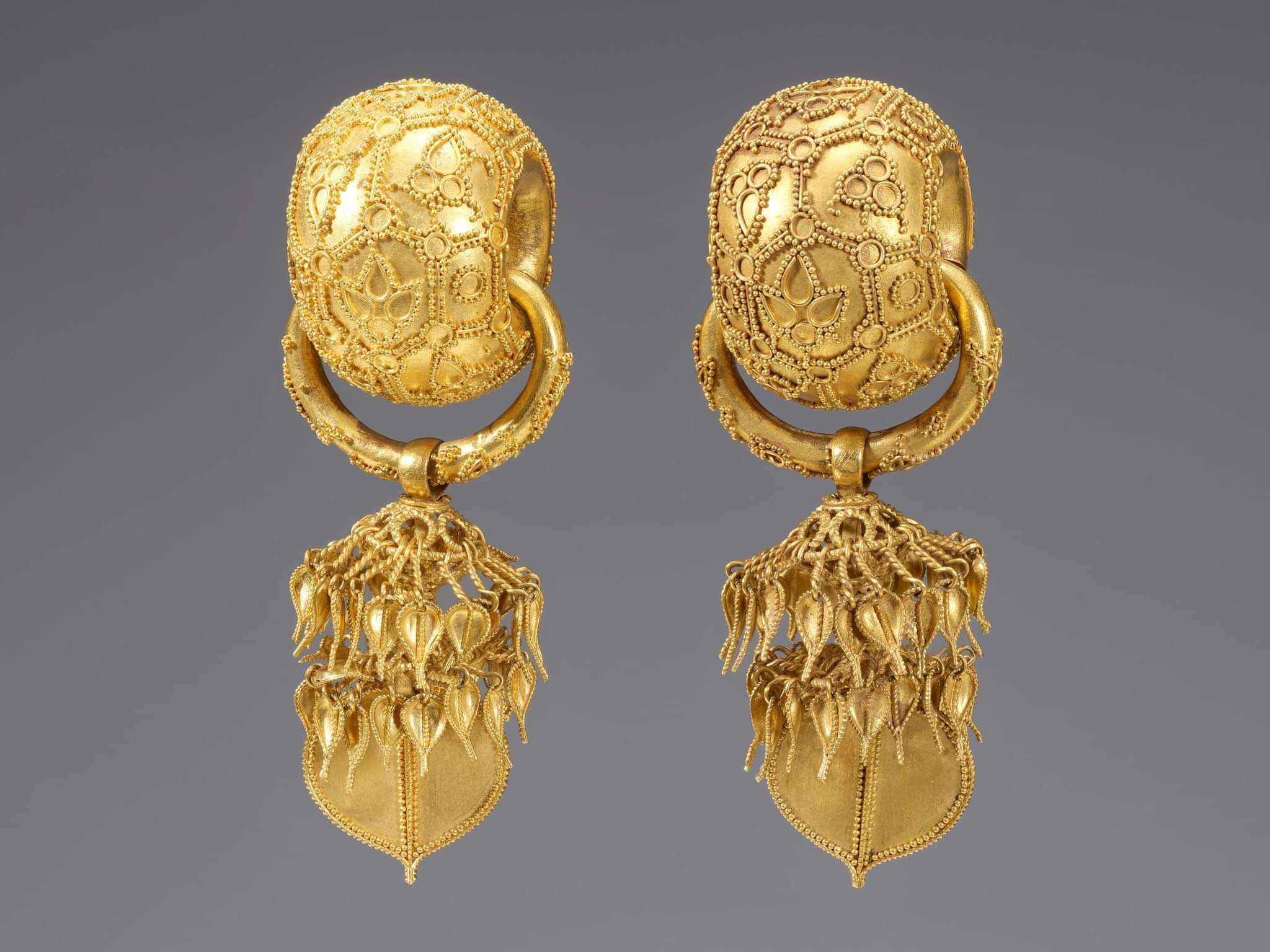 With exquisite decorations made with gold granules and thread along with dozens of attached gold spangles, these are certainly the finest earrings yet discovered from the Three Kingdoms Period (57 BCE - 668 CE).