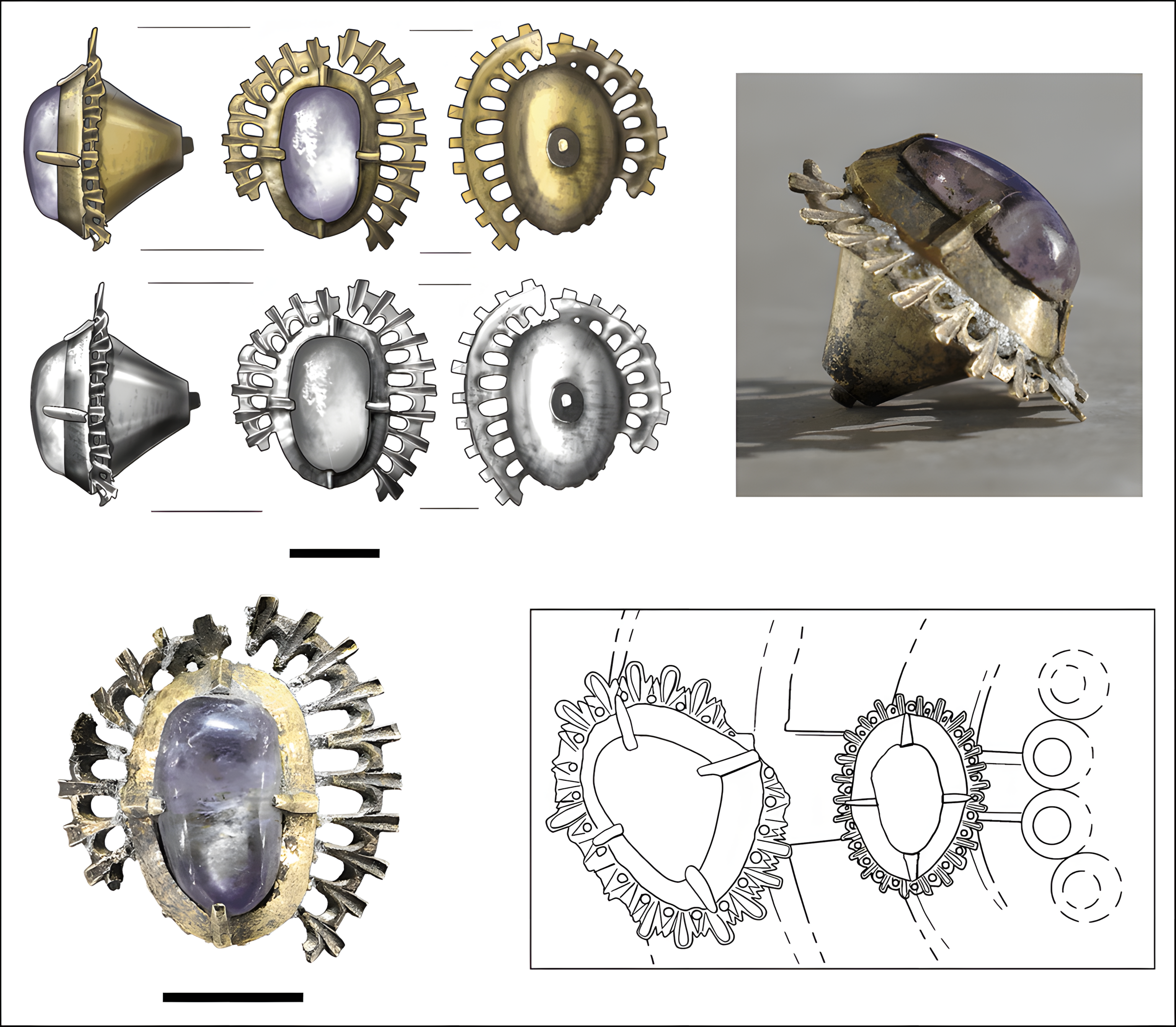 원뿔형 은제 발톱 모양 마운트conical silver claw mount에 세팅된 자수정 카보숑amethyst cabochon은 투각 세공된 광선openwork rays이나 팔메트 꽃잎palmette petals으로 이루어진 정교한 후광halo으로 둘러싸였는데, 이는 13세기 국제적인 고급 패션과 관련된 장식 요소다.