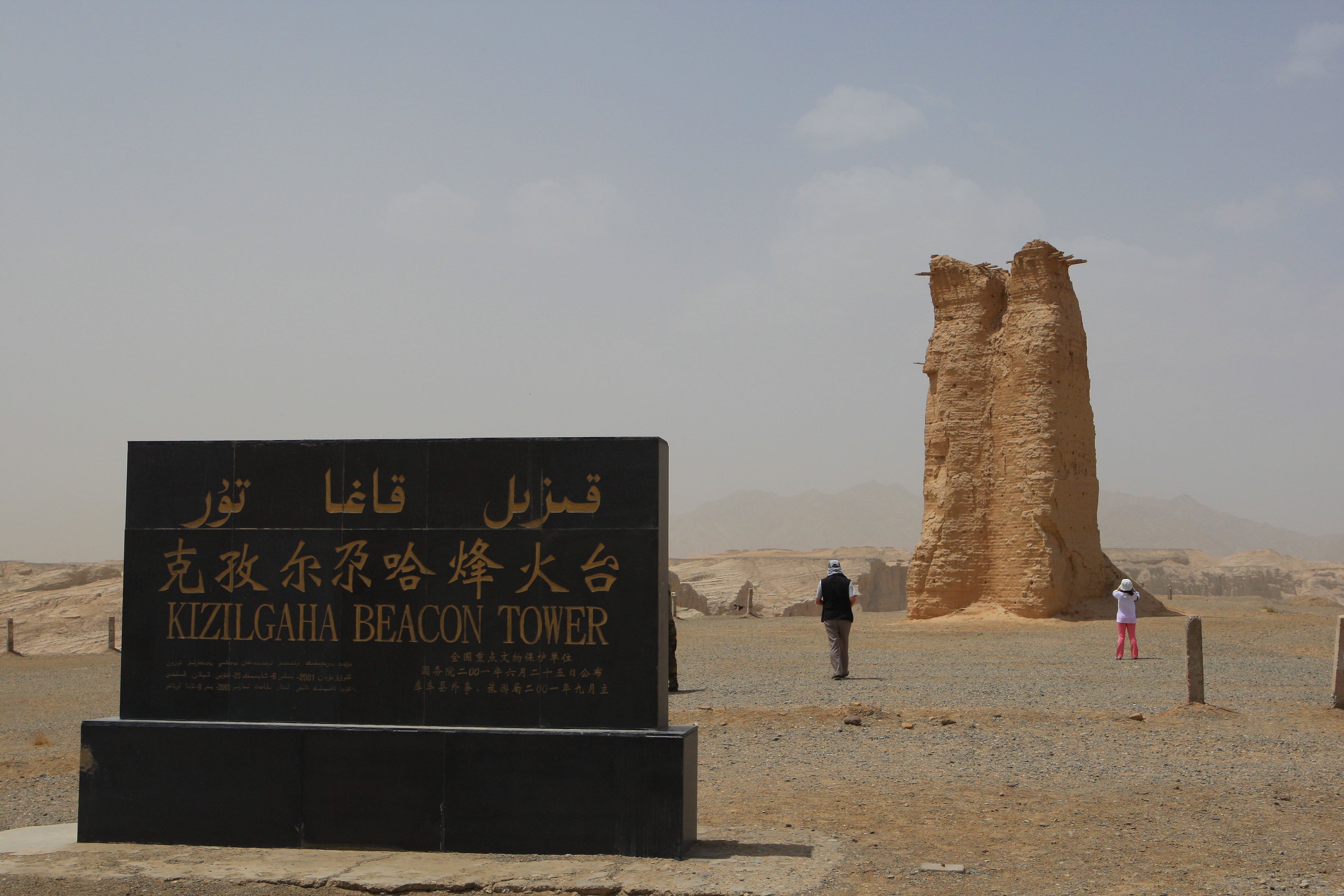 The Kizilgarha beacon tower is located 12 kilometers northwest of Kuqa county seat and only 1,000 meters away from the Kizilgarha Thousand Buddha caves. It is a military alarm facility during the Han Dynasty.
