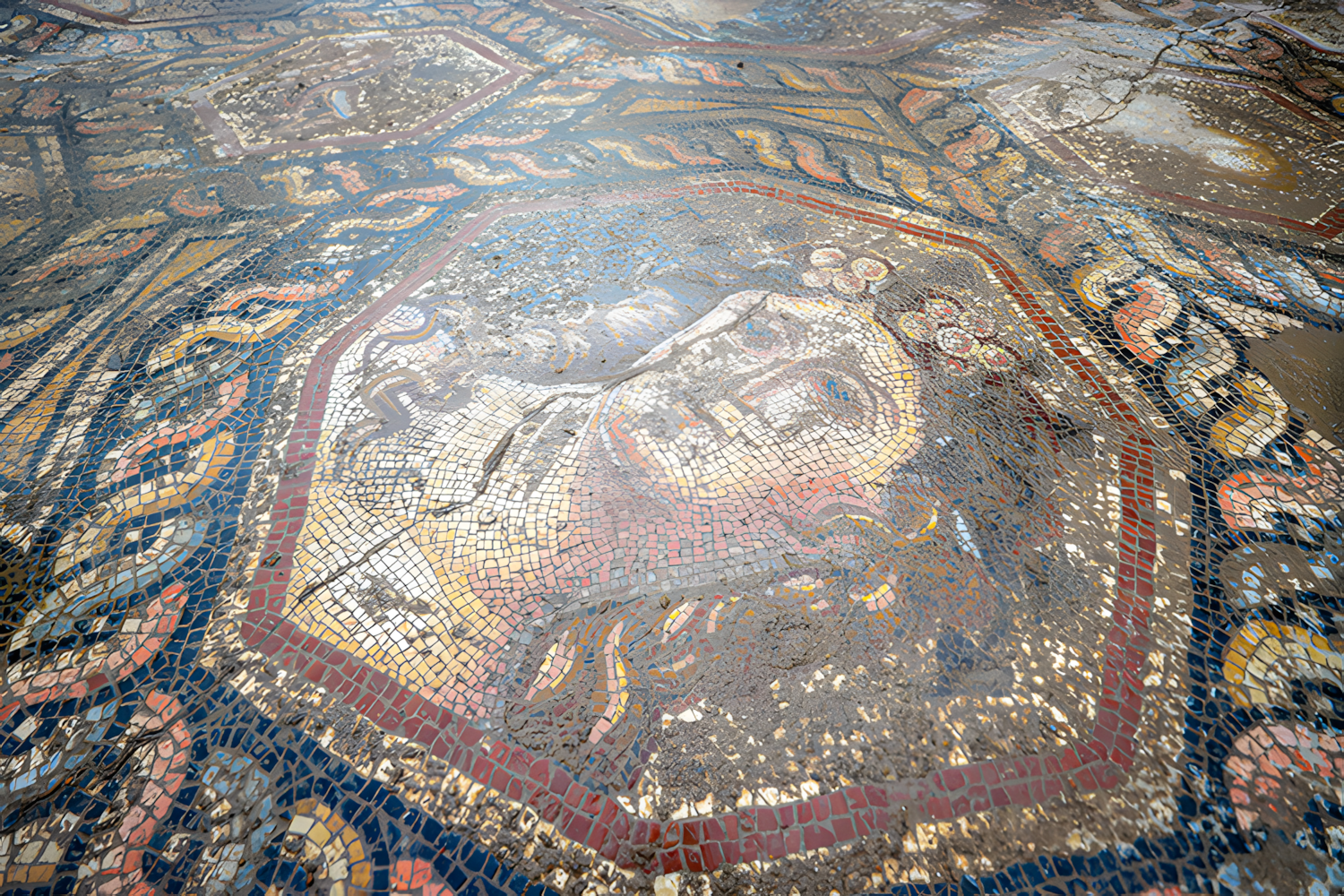 작업자들이 색색 돌 테세라tesserae로 만든 얼굴의 작은 부분을 발견하자 당국은 즉시 공사를 중단했다.
