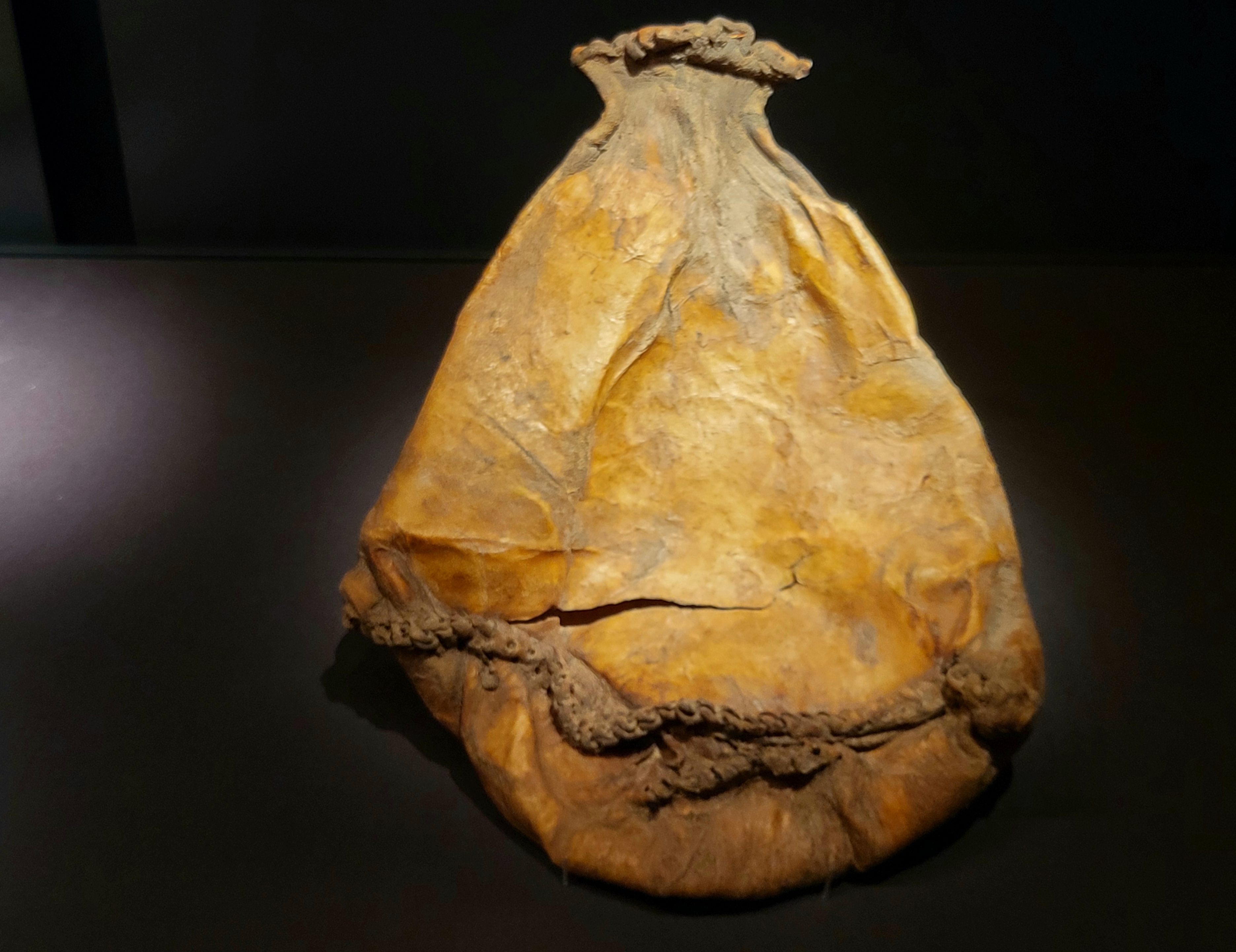 This leather bag, with a narrow top that flares down to form a wider bottom, resembles a "chiyi" (translated as "owl"), as mentioned in "Biography of Wu Zixu" in Volume 66 of Sima Qian's Records of the Grand Historain. The name "chiyi" comes from the bag's resemblance to the round body of owl. Made from horse leather, with traces of stitching at the top and bottom, this type of bag was likely used by nomadic people to carry water or salt.