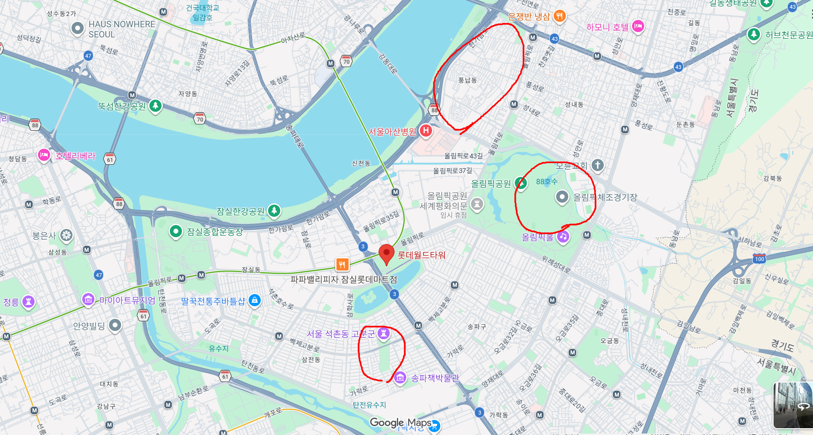 롯데월드타워를 중심으로 인근에 포진하는 주요 문화재들이다. 예서 방이동고분군은 빠졌지만 석촌동고분군 인근이다.