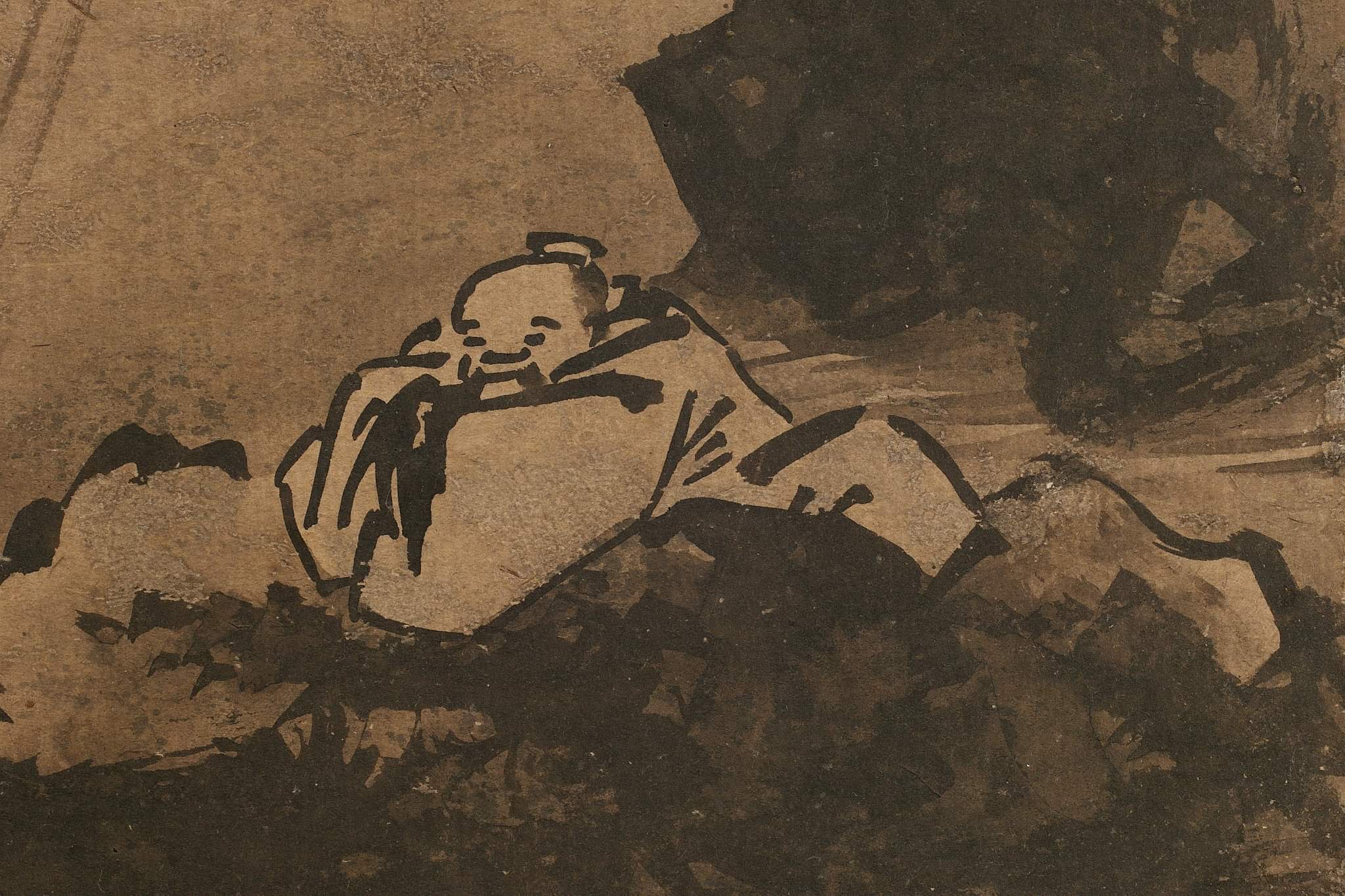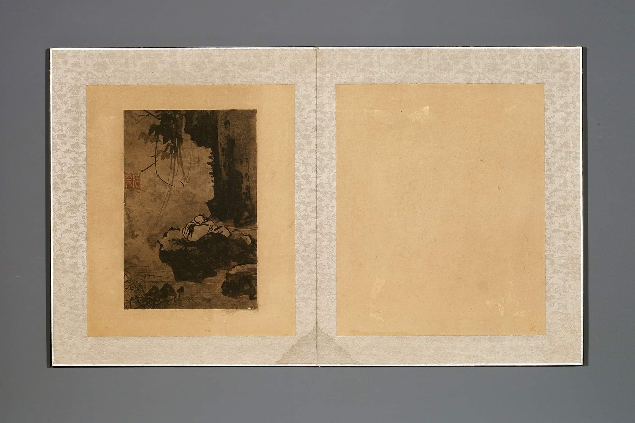 It exemplifies the style of jansan ingsu (meaning “partially depicted landscapes”) associated with Southern Song landscape paintings in China, which usually feature only sparse landscape elements, such as a single large rock and tree, against an empty space.