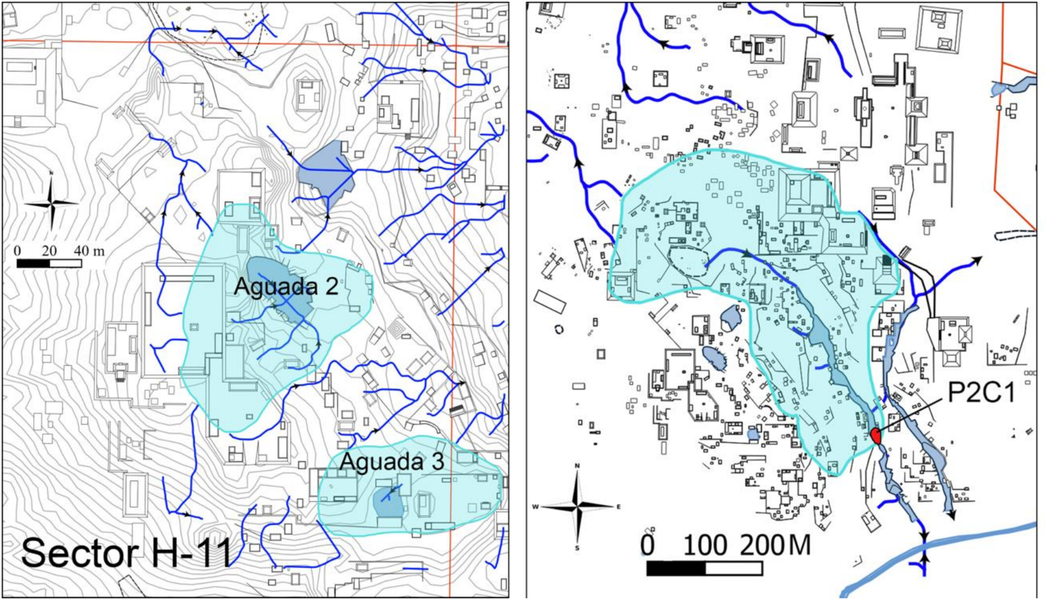 과테말라 북부 우카날 유적에서 각각 다른 기능을 지닌 세 개 저수지, 즉 부유한 지역에 물을 공급한 아과다Aguada 2, 서민 거주 지역에 위치한 아과다 3, 그리고 도시 배수 시스템과 연결된 피시나Piscina 2가 발굴 및 분석되었다.
