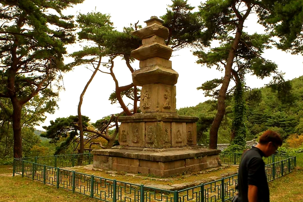 A pagoda is located east of the temple site, and one, to the west. The two, restored during the Japanese colonial rule of Korea (1910~1945), are identical in size and sculptural embellishment. The overall construction and styling -- especially the two pillars carved on the upper and lower parts of the pedestals -- indicate that they were built during the Unified Silla Period (668~935). The figures carved on the upper part of the pedestals are the 12 figures of the Oriental zodiac, and the 4 figures carved on the first story of each pagoda are Lokapala, Guardian Kings of the Four Quarters, the world, and the Buddhist faith. Between two pagodas is a stone lantern.