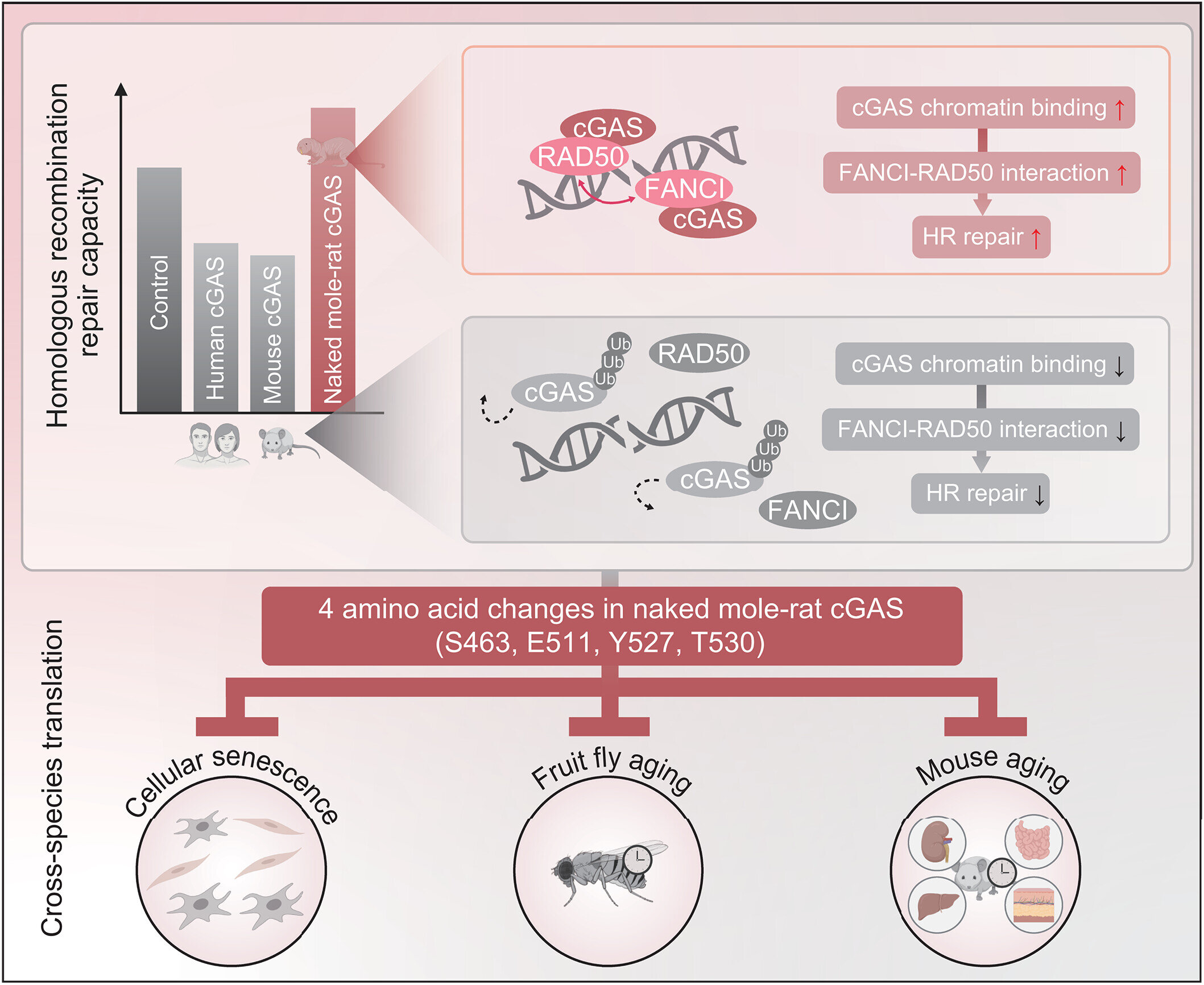 연구진은 "이러한 변화는 벌거숭이두더지쥐 cGAS가 유전체를 안정화하고, 세포 노화와 장기 노화를 막고, 수명과 건강 수명을 연장하는 더 큰 능력을 갖게 한다"고 설명했다.