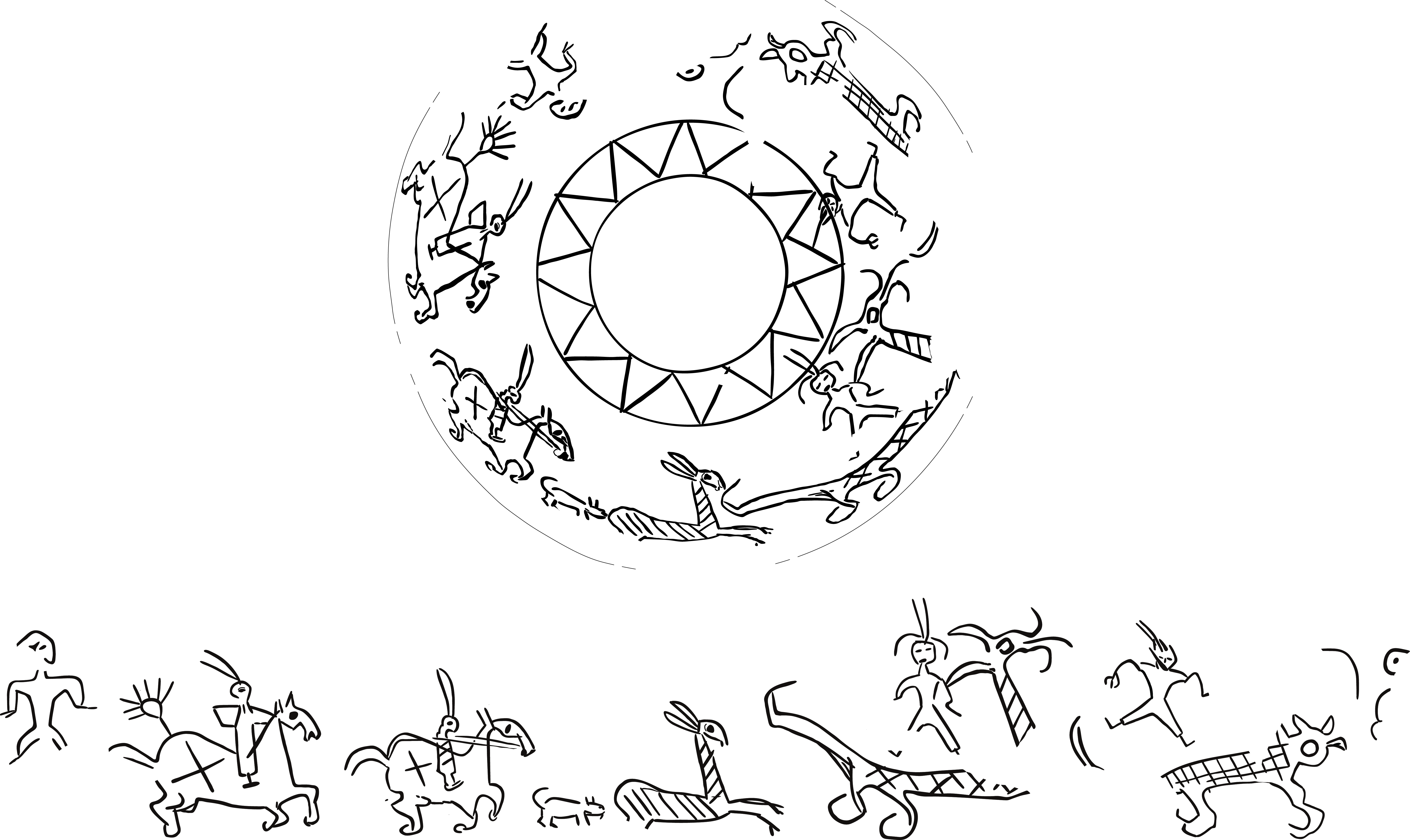 The human and animal figurines unfold a panorama, with human characters regularly interspersed by repetitions of a snake biting a frog’s hind leg.