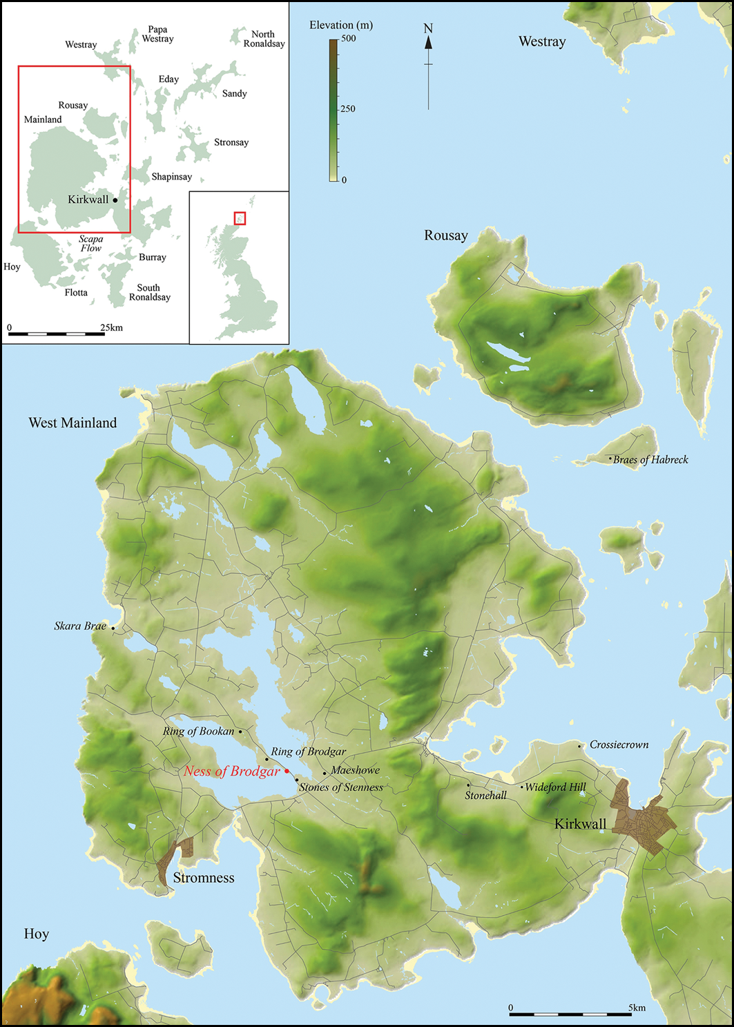 First made and used during the Mesolithic (c. 10 000–4000 BC) in Northern Europe, polished stone axes were widely circulated in Britain and Ireland during the Neolithic (c. 4000–2500 BC). Central to the earliest discussions of prehistory, they maintain a high profile in current research (Risch et al. Reference Risch, Pernicka and Meller2024). In Britain, a long history of petrological studies means that we can identify the raw-material sources and distributions of many Neolithic axe-heads (Clough & Cummins Reference Clough and Cummins1979, Reference Clough and Cummins1988; Bradley & Edmonds Reference Bradley and Edmonds1993; Davis & Edmonds Reference Davis and Edmonds2011). The patterns of circulation are sometimes striking, suggesting that axes had a dual importance as everyday tools and as tokens of identity and value (Edmonds Reference Edmonds1995). Yet, only recently have we begun to understand the activities in which axe-heads were used. While it was long assumed they were instruments of forest clearance, research now suggests that their uses were often more varied (Masclans et al. Reference Masclans, Palomo and Gibaja.2017; Roy et al. Reference Roy, Crellin and Harris2023). Our project draws on these advances in knowledge, exploring variations of use and treatment, through a regional lens, by examining axe-heads from Neolithic Orkney (Figure 1). Here, we present an outline of the project and summarise results from the first stage of our analyses.
