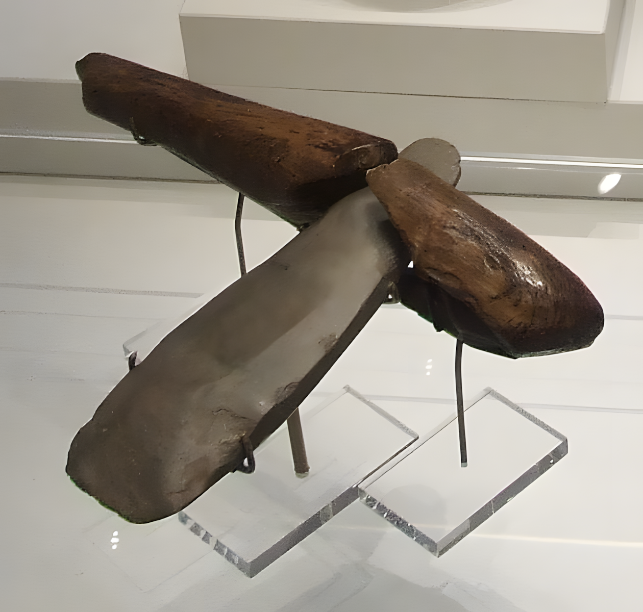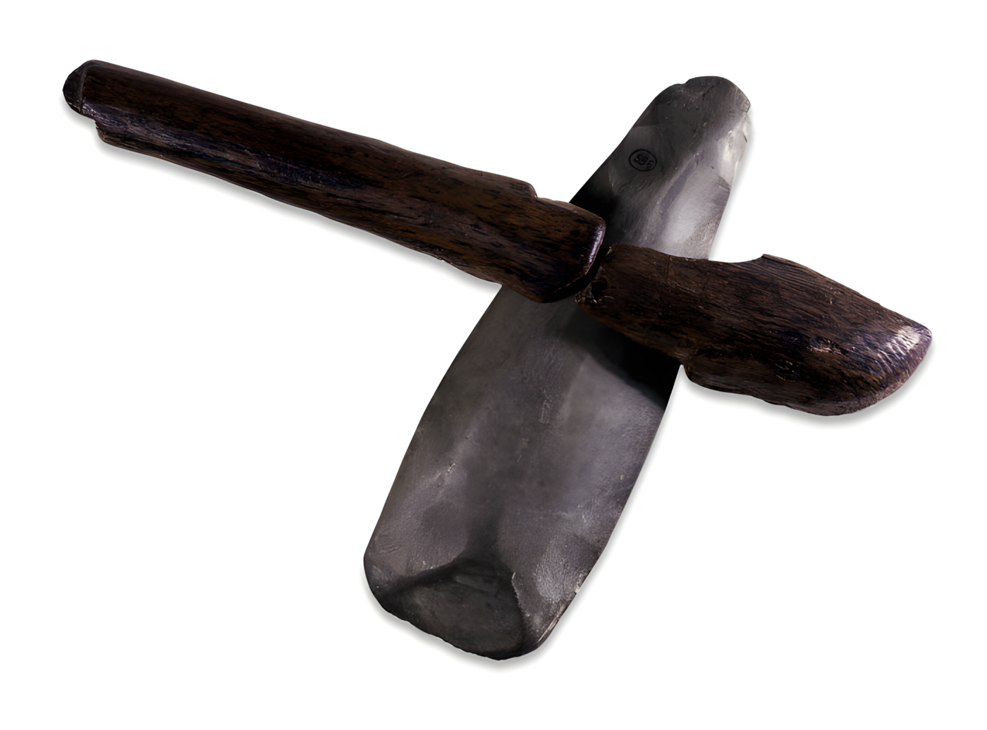 A Neolithic stone axe with a wooden handle, found at Ehenside Tarn. It is on display in the British Museum, London.