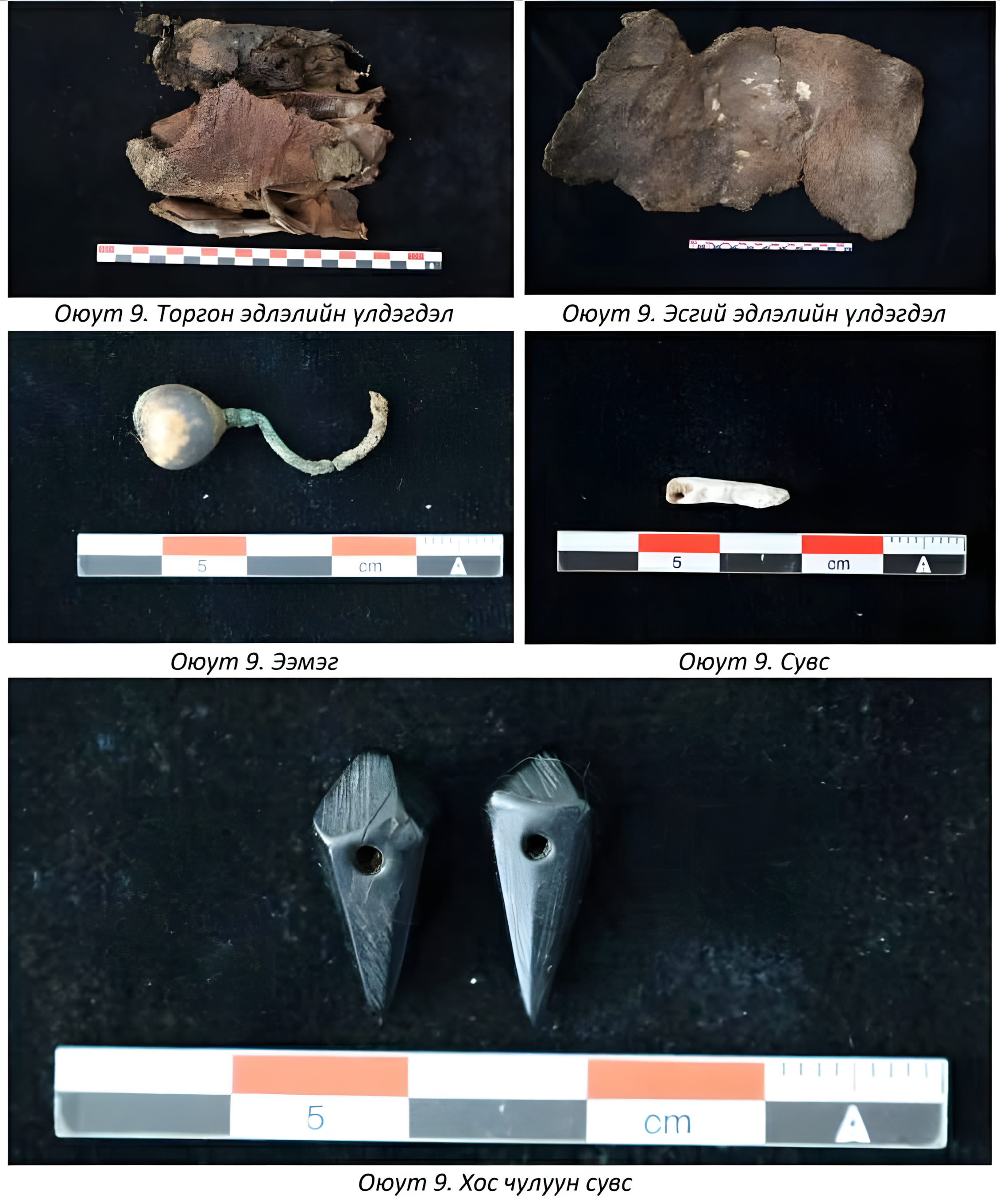 무덤에서 발굴된 유물에는 청동 톨리toli (거울), 펠트 조각, 동물 뼈, 그리고 다양한 장례 부장품이 포함된다.