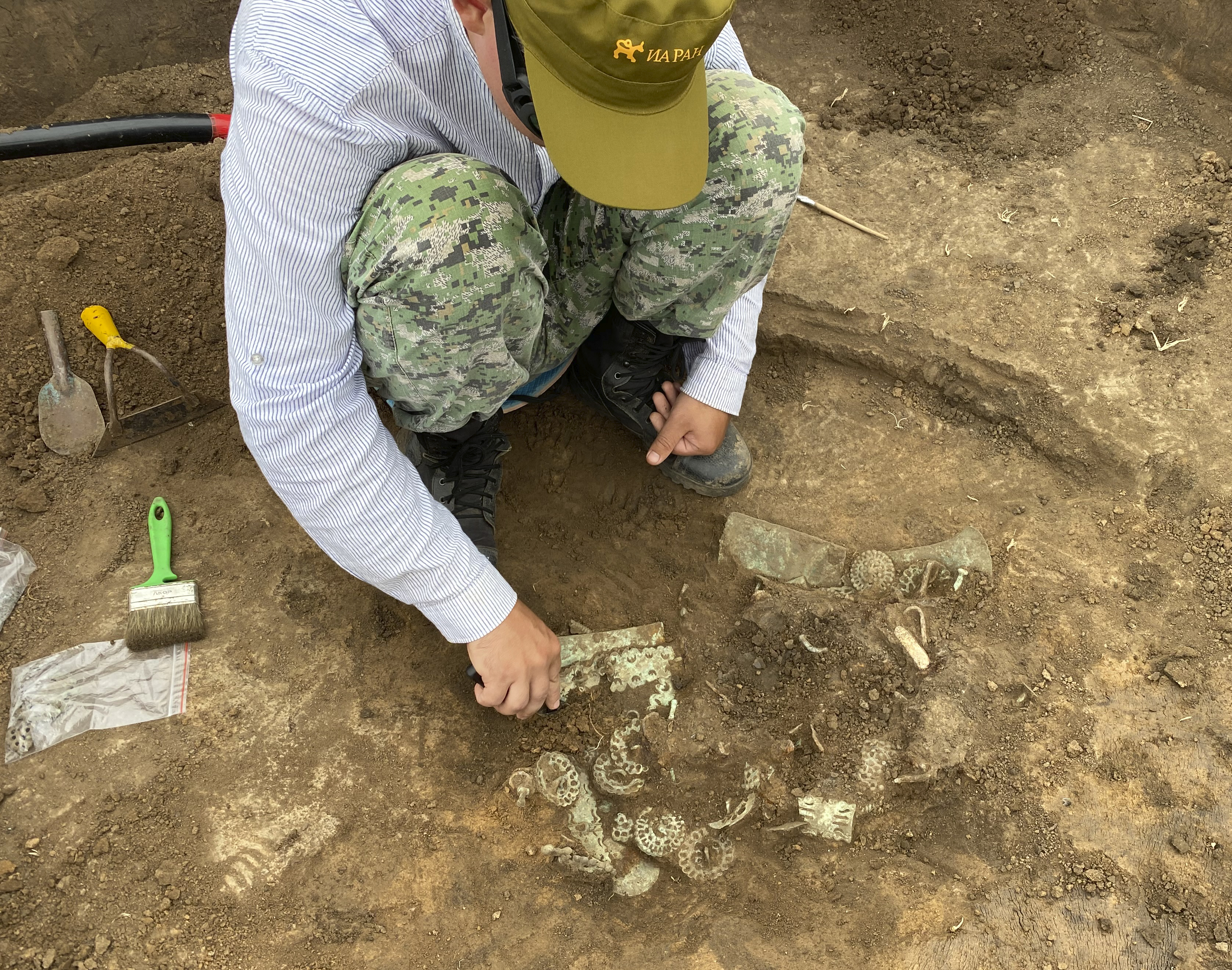 러시아 과학 아카데미 고고학 연구소에서 발견한 이 유물들은 희귀한 청동 가면 펜던트bronze mask pendants, 투각 청동판openwork bronze plates, 고급 마구, 그리고 호랑이 머리와 앞다리를 새긴 금판으로 가득 찬 얕은 의례 구덩이를 중심으로 출토되었다.