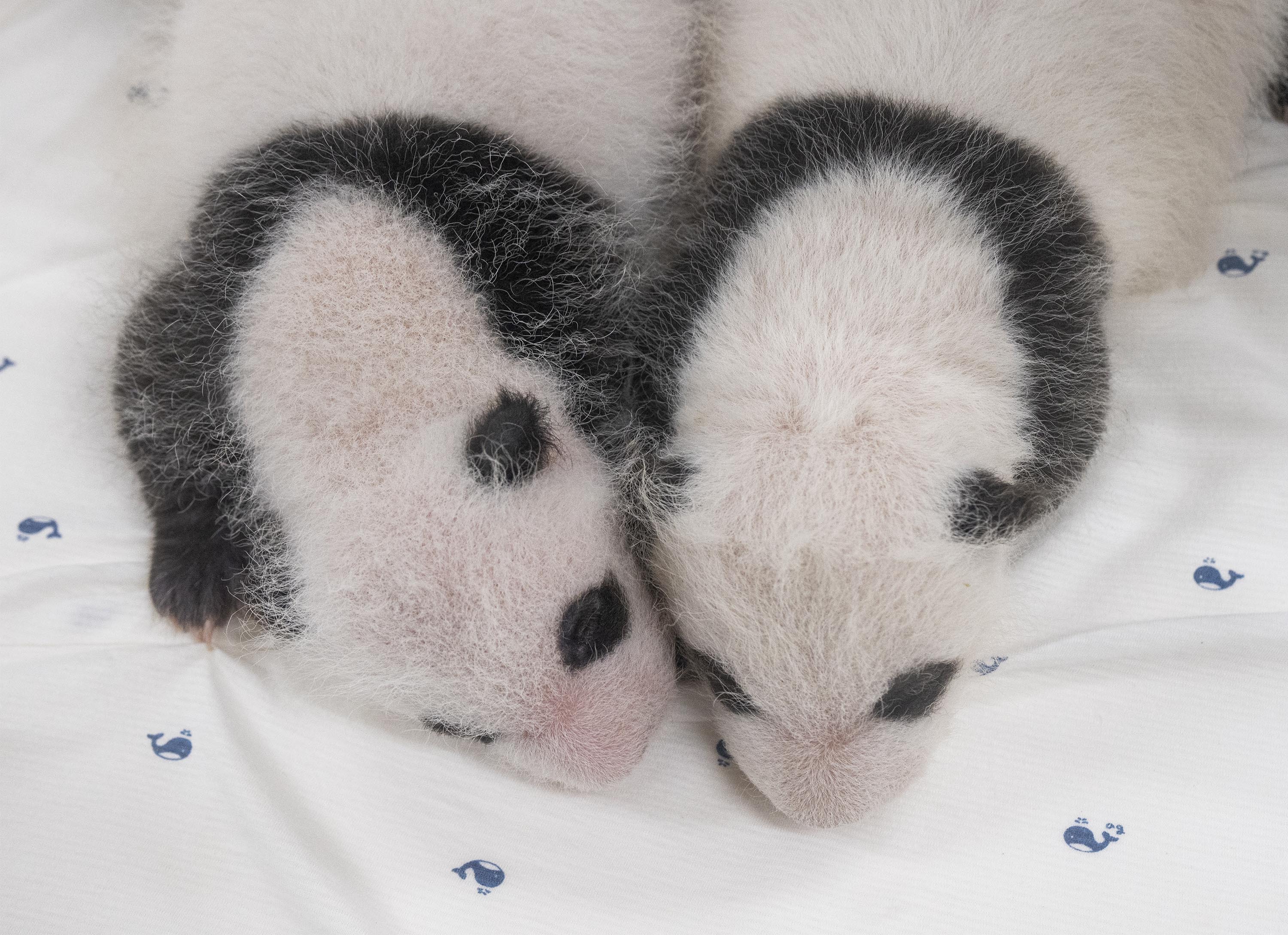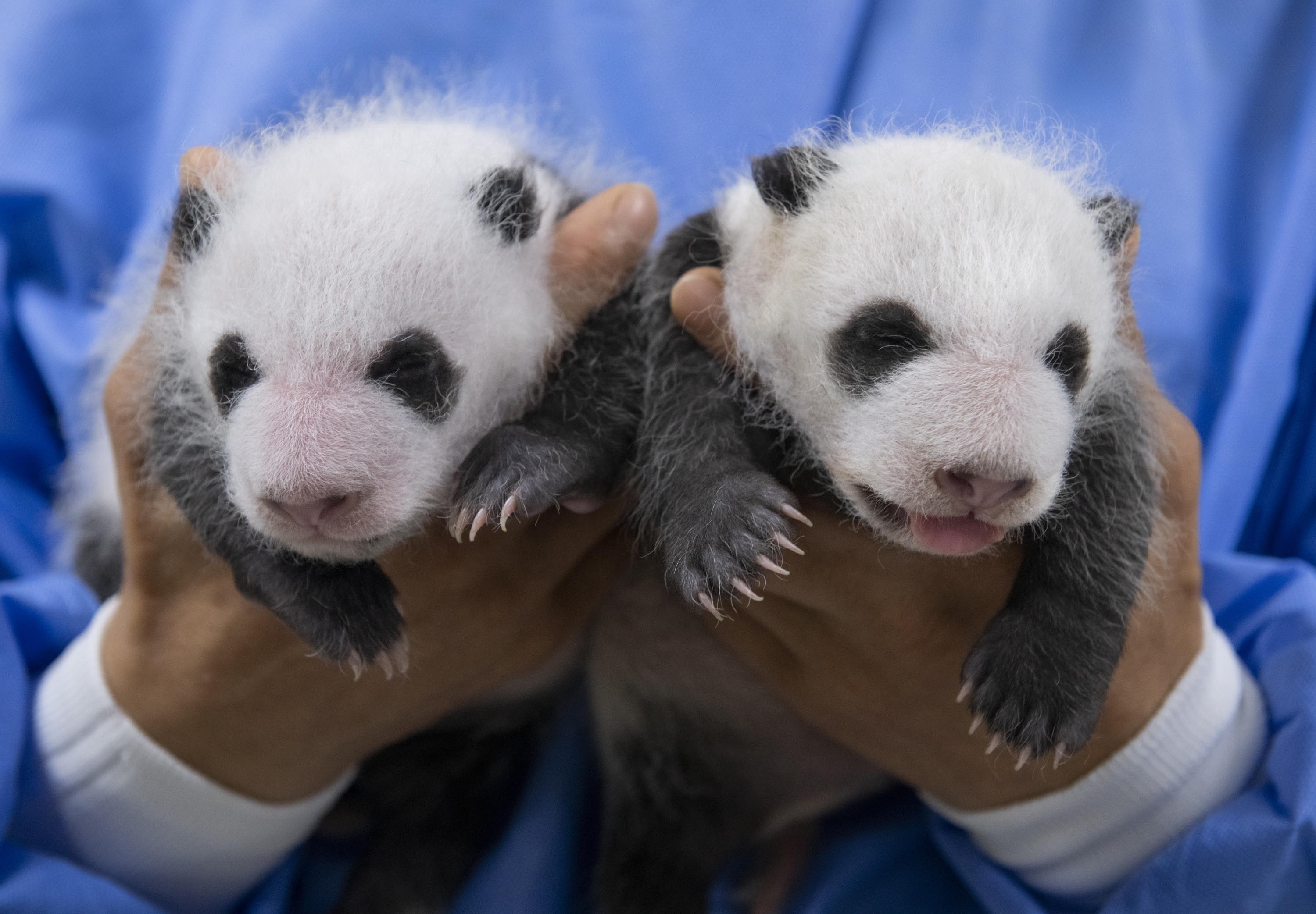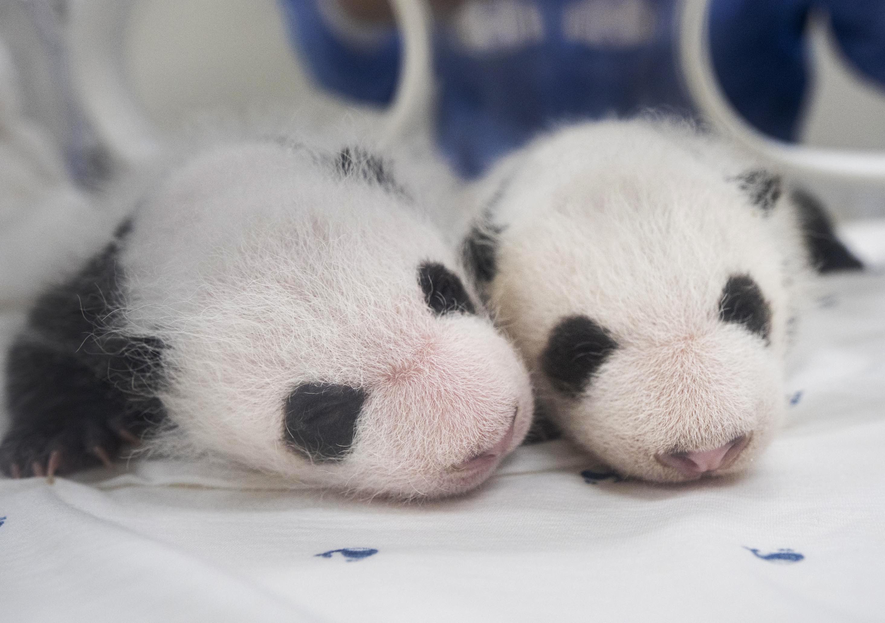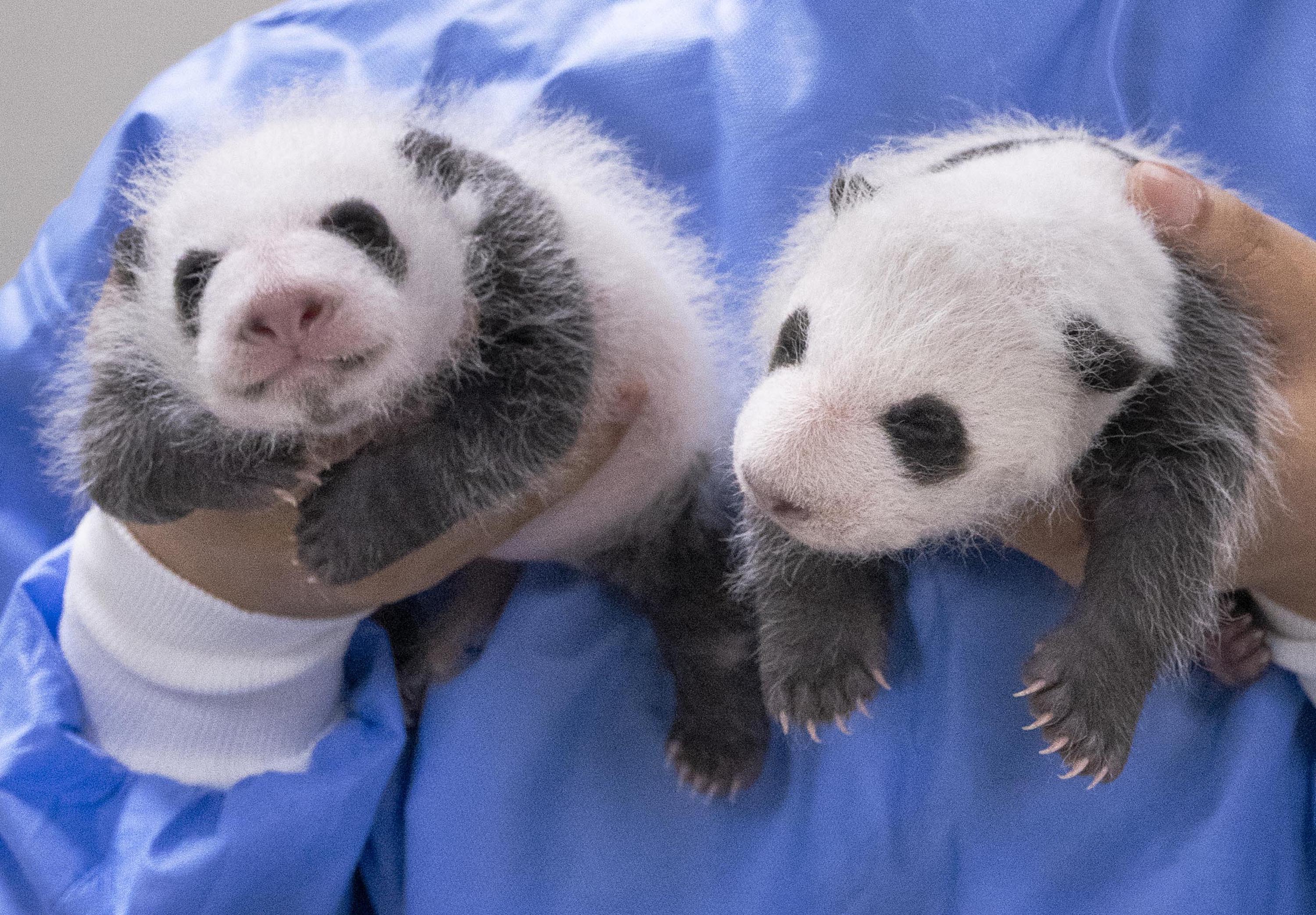 These photos, released by Everland on Aug. 7, 2023, show twin female giant panda cubs marking the one-month anniversary of their birth.