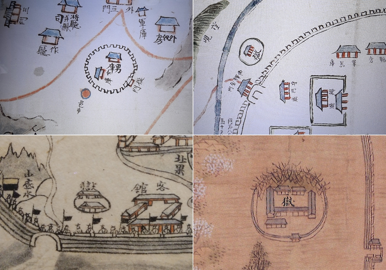 Prisons that appeared on the late Joseon Dynasty-era maps. Prisons in Eunjin, Chungju, Jeju Island, and Jeonju from the top left to the clockwise direction