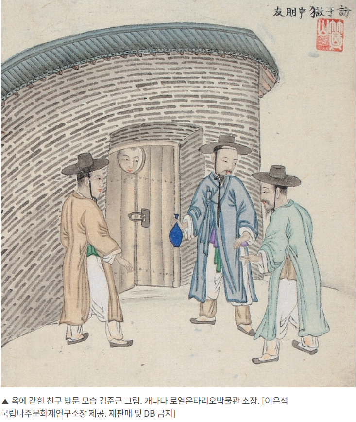 It is a picture of a person visiting his friend in prison at the end of the Joseon Dynasty. It was painted by an artist named Kim Jun-geun and is now housed at the Royal Ontario Museum.