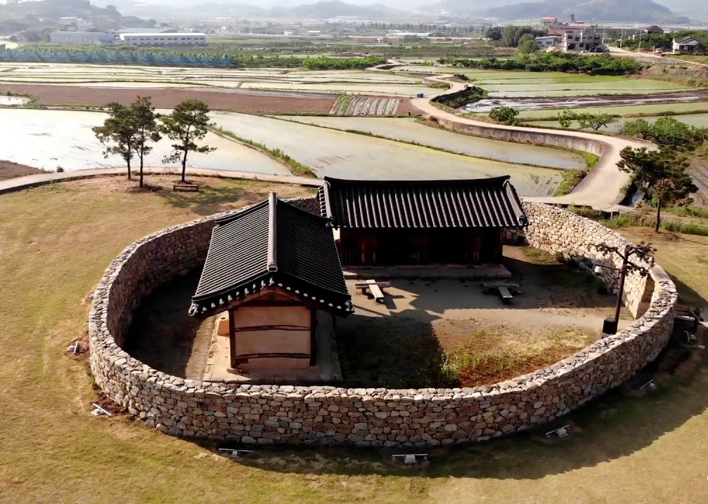 A prison excavated in Gyeongju in 1997. Two buildings are attached side by side inside the circular wall.