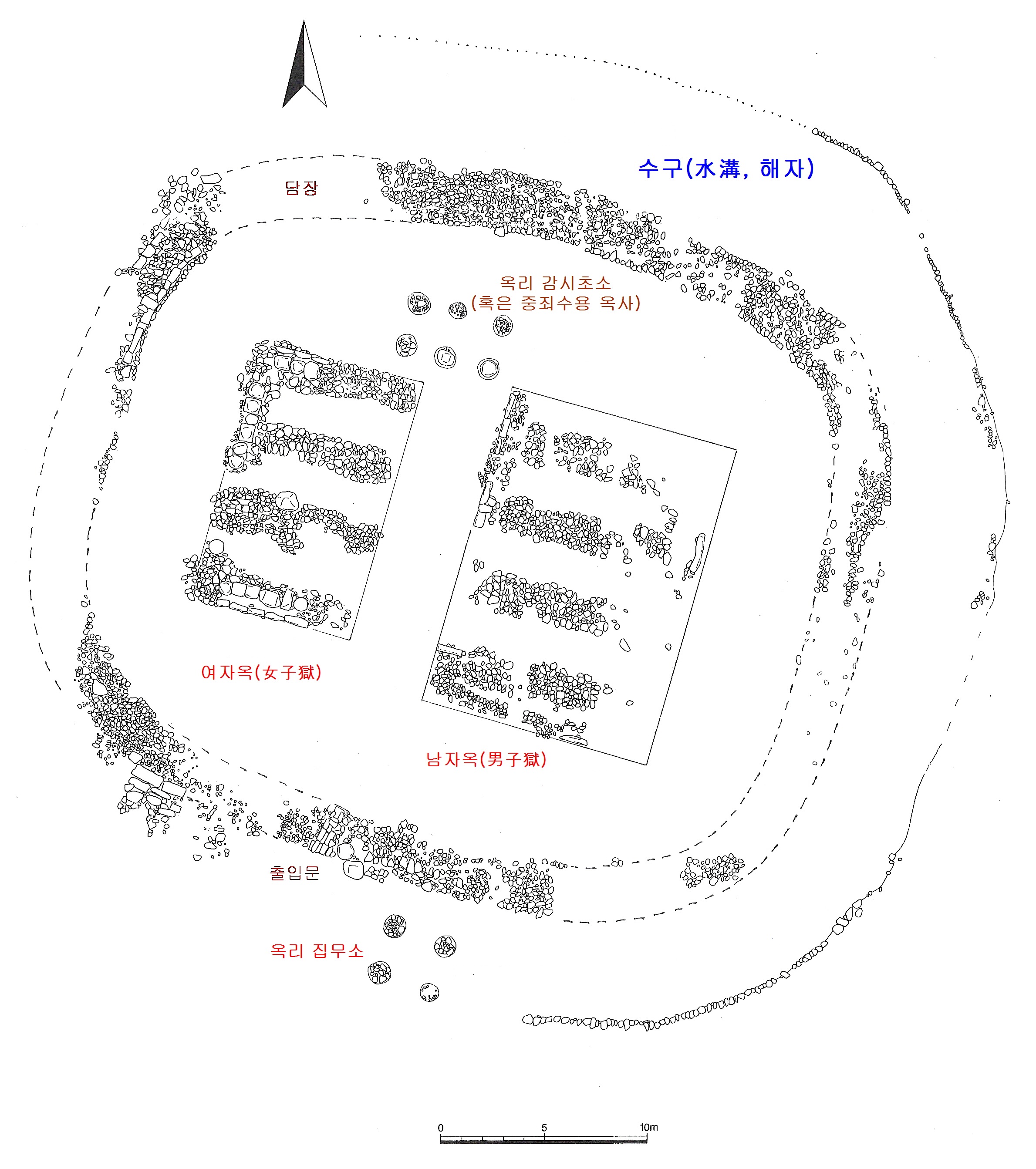 A prison at Yeonil-eupseong Fortress, Pohang excavated from 2003 to 2004. Its gate and Ok-ri office are directly attached.