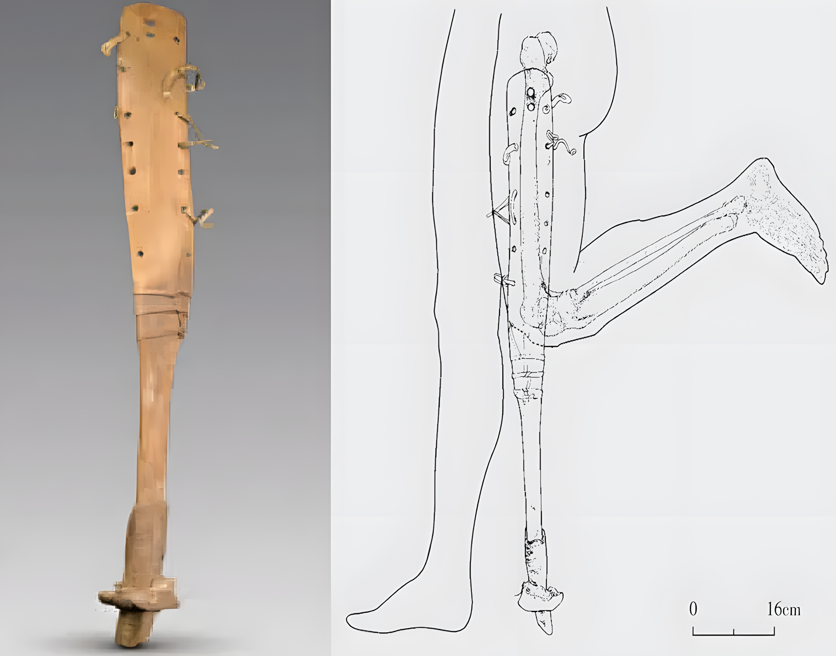 고고학자들은 이 의족이 "포플러 나무poplar wood로 만들었으며, 양쪽에 가죽 테이프가 달린 구멍이 일곱 개 있어 기형 다리에 부착할 수 있도록 했다"고 기록했다.