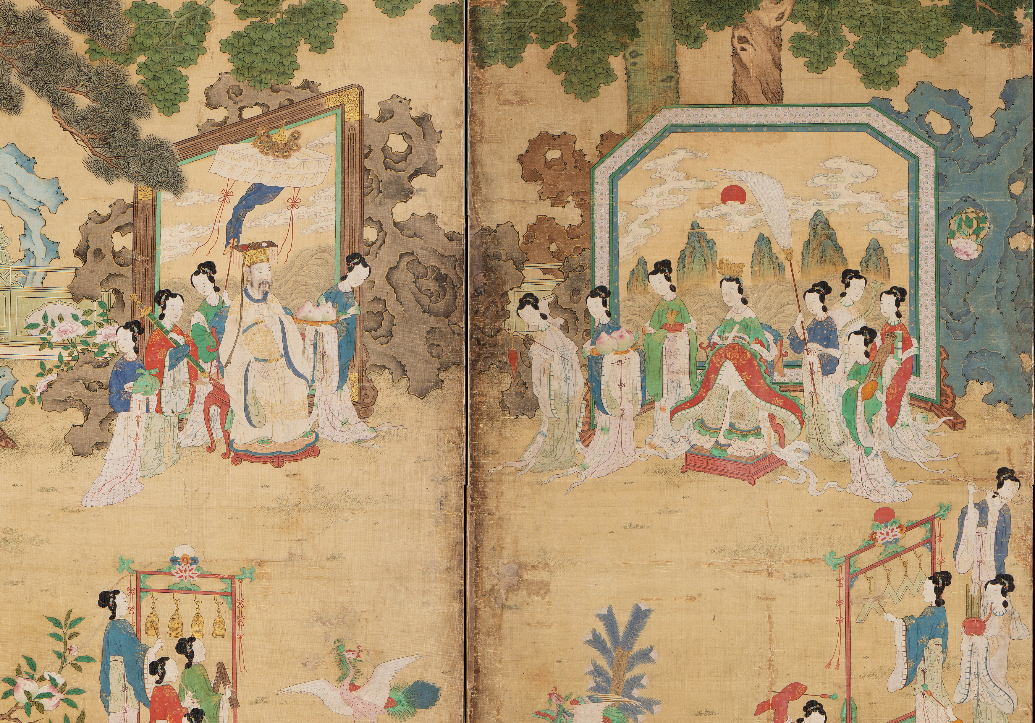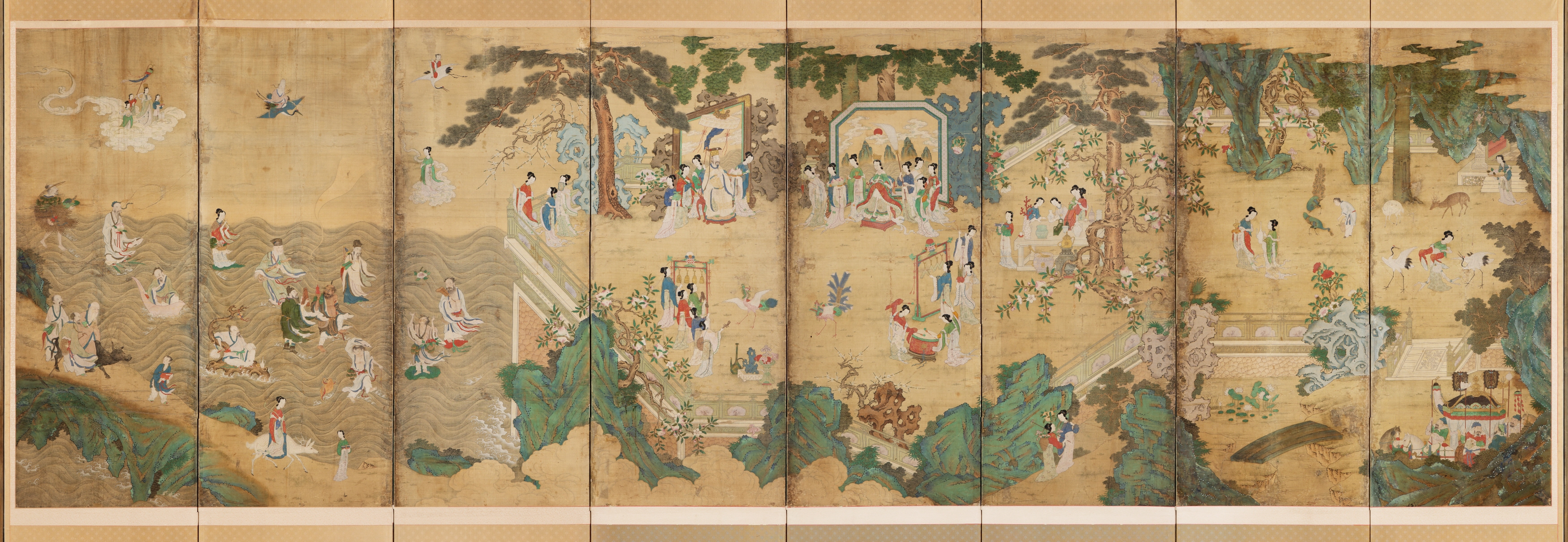 Made in the 19th century, the 5.04m long and 2.21m wide screen is Yojiyeondo (瑤池宴圖) painting depicting the Banquet of Seowangmo, Queen Mother of the West, with immortals arriving at her palace with peach garden.