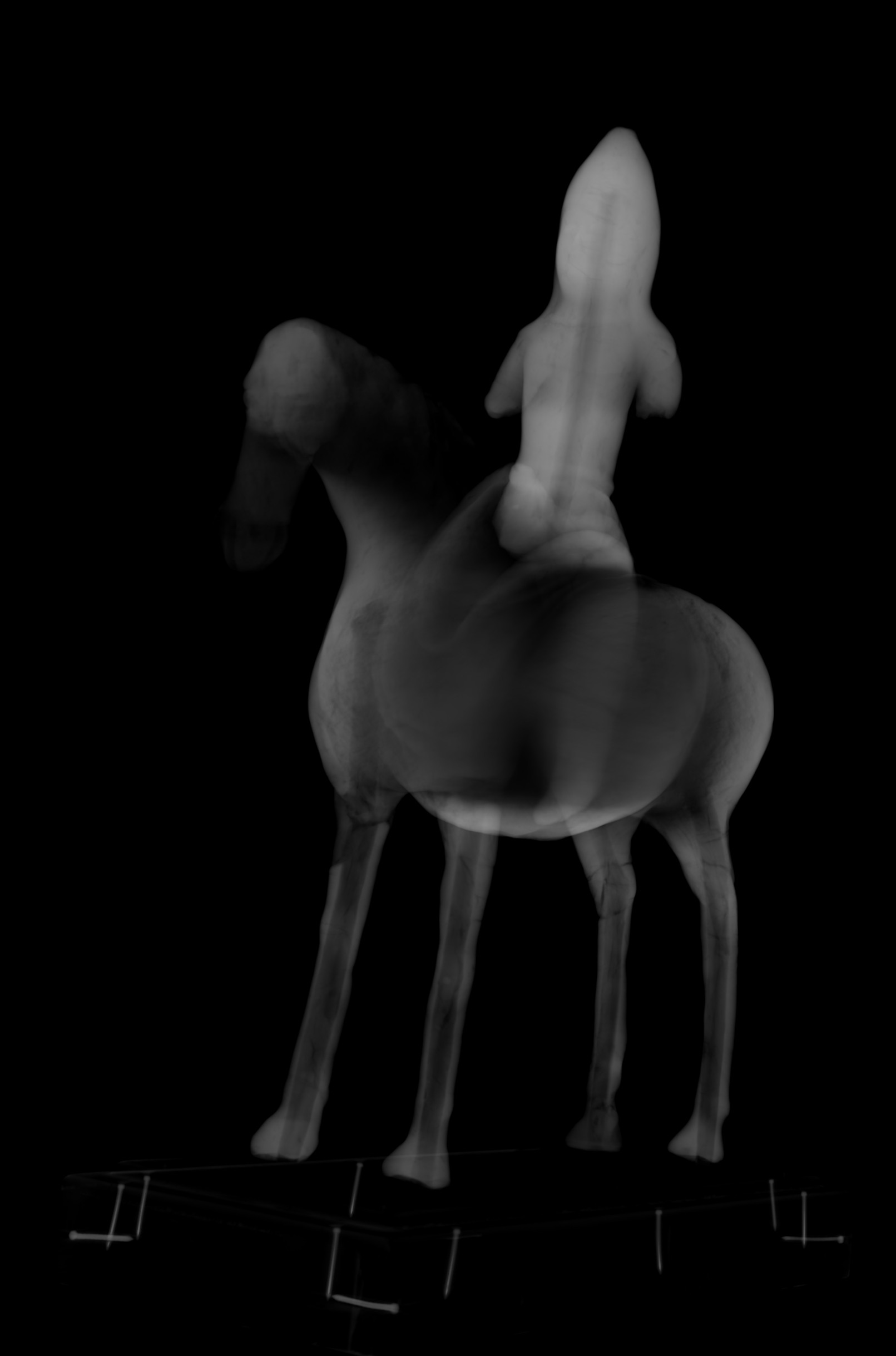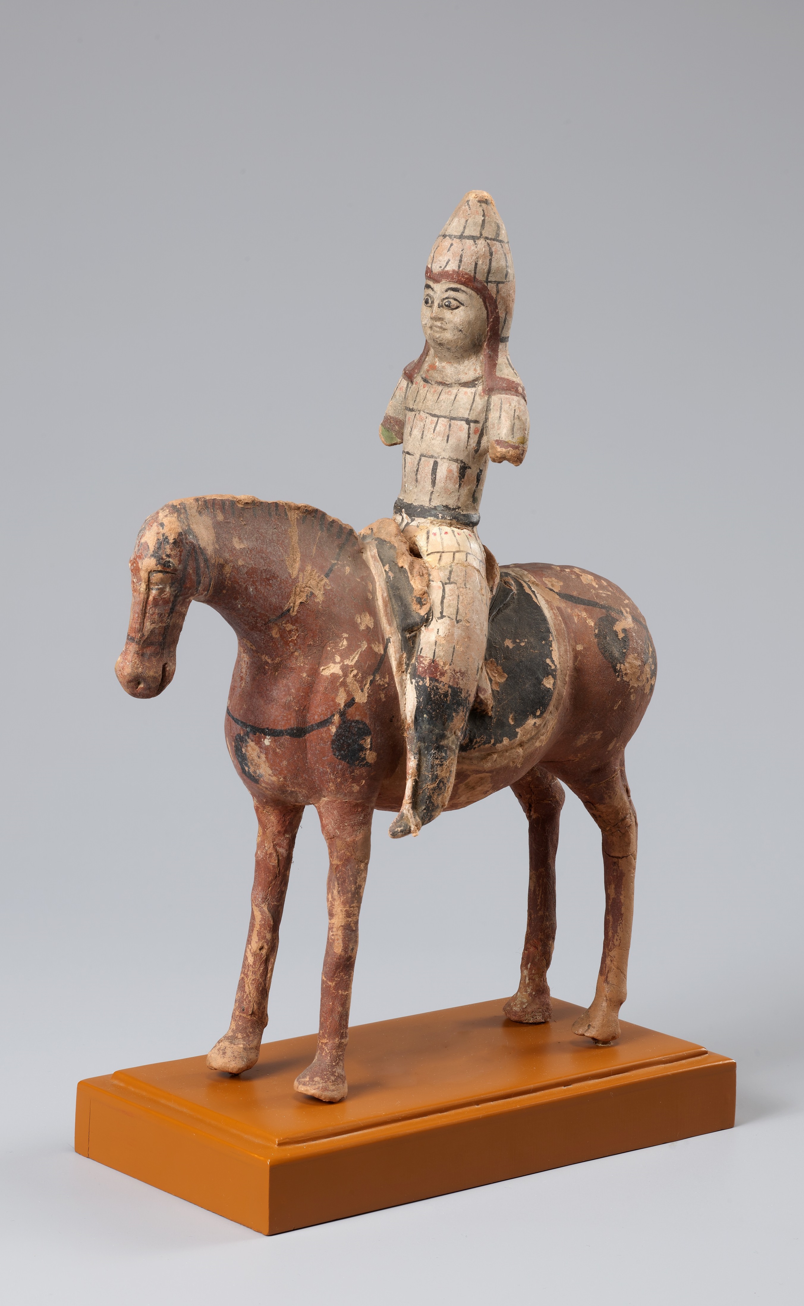 The 'Wooden Trays Used as Funerary Objects' is exhibited in a set referencing the list of items and photographs from the time of the museum’s acquisition, and the 'Figurine of Warrior Riding a Horse ' placed in the room next to the tomb was restored by reassembling fragments.