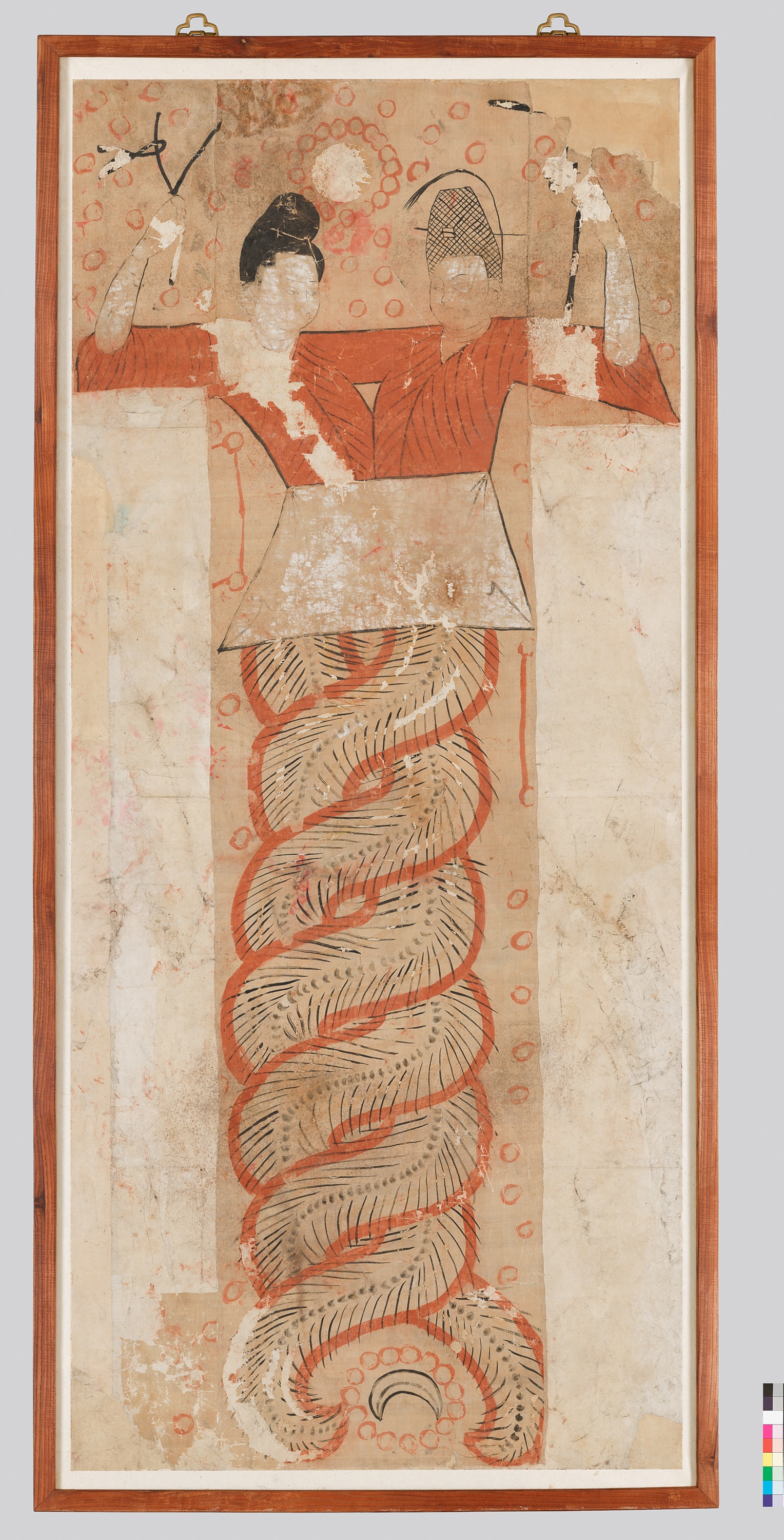 In particular, the “Painting of Fuxi and Nüwa,” which depicts male Fuxi and female Nüwa appearing in the Chinese myth of creation, is hung from the ceiling of the exhibition room to feel the atmosphere inside the tomb. The figure shows two creators with the upper body of a human and the lower body of a snake.